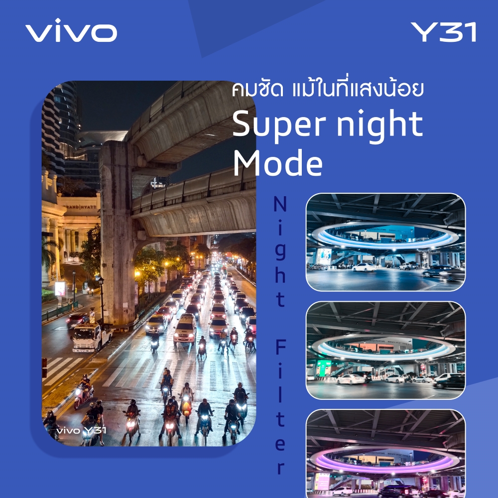 Vivo Y31 มาพร้อมกับกล้องหลัง AI คุณภาพถึง 3 ตัว ทั้งเลนส์กล้องหลัก 48 ล้านพิกเซล และ กล้องหน้า 8 ล้านพิกเซล ให้ภาพเซลฟีสวยเป็นธรรมชาติ รวมทั้งกล้องเลนส์โบเก้ (Bokeh) และกล้องเลนส์ Super Macro ที่พร้อมให้คุณเลือกเก็บความทรงจำได้ในหลายรูปแบบ มอบโอกาสให้คุณสามารถเลือกถ่ายภาพได้ในแบบที่ถูกใจ ไม่ว่าจะเป็นการถ่าย Portrait เก๋ๆ มีโบเก้ประดับ ถ่ายวิวสวยๆ อวดเพื่อนในโซเชียล หรือถ่ายภาพกลางคืนด้วย Super Night Mode ที่อัลกอริธึมสามารถประมวลผลภาพให้คมชัดยิ่งขึ้น และยังมีฟิลเตอร์ Stylish Night ที่มาพร้อมตัวเลือกถึง 4 แบบ เรียกได้ว่างานนี้ไม่ว่าจะออกไปเที่ยวที่ไหน ก็สามารถเก็บทั้งรูปภาพและวิดีโอเป็นความประทับใจได้แบบไม่มีลืม