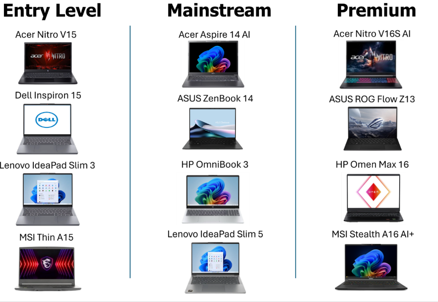 ตัวอย่าง AI PC แนะนำ เช่น Acer Nitro V 15, Dell Inspiron 15, Lenovo IdeaPad Slim 3 สำหรับผู้เริ่มต้น, Acer Aspire 14 AI, ASUS Zenbook 14, GIGABYTE AERO X16 สำหรับผู้ใช้ระดับเมนสตรีม และ HP OMEN MAX 16, MSI Stealth A16 AI+ สำหรับผู้ใช้ระดับพรีเมียม ทั้งหมดมาพร้อม NPU ประสิทธิภาพสูง แบตเตอรี่ยาวนาน และหน้าจอคุณภาพดี