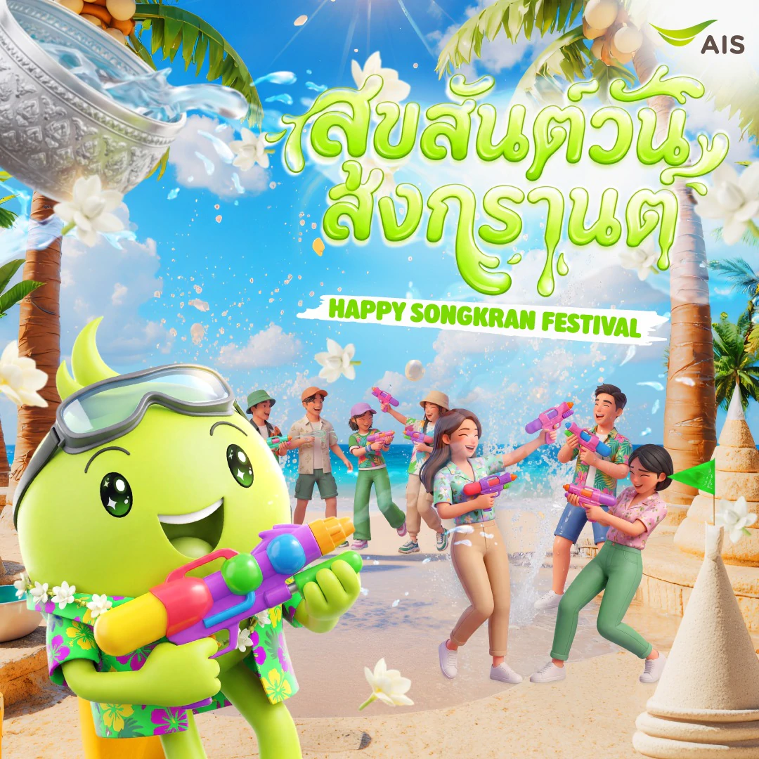 AIS ยังคงมุ่งมั่นดูแลลูกค้าในทุ กโมเมนต์ของเทศกาลสงกรานต์ เพื่อให้สงกรานต์ปีนี้เต็มไปด้ วยความคุ้มค่า ความสะดวก และความสุขแบบจัดเต็ม ดูรายละเอียดเพิ่มเติมได้ที่ www.ais.th