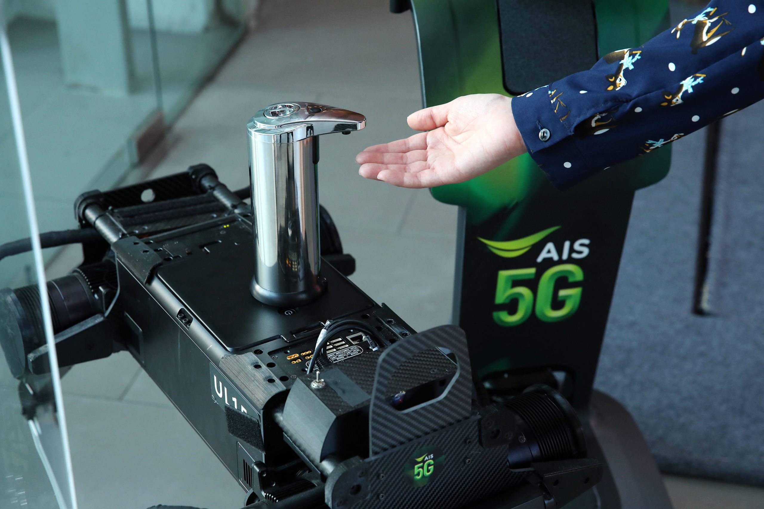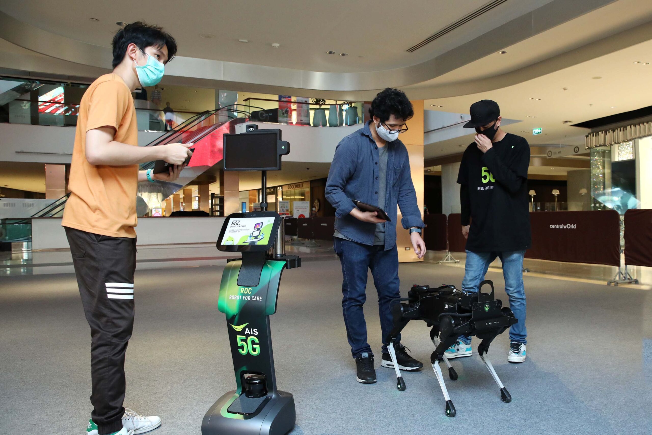 2. นำหุ่นยนต์ ROBOT FOR CARE (ROC) ช่วยปฏิบัติหน้าที่คัดกรองและตร วจวัดอุณหภูมิก่อนเข้าศูนย์ การค้า ซึ่งเป็นหุ่นยนต์บริการทางการแพ ทย์ที่ทำหน้าที่เป็นผู้ช่ วยตรวจรักษาพยาบาลผู้ป่วยCOVID- 19 ในโรงพยาบาล ตามที่เอไอเอสให้การสนับสนุน ภายใต้ภารกิจ AIS 5G สู้ภัย COIVD-19 มาก่อนหน้านี้ และหุ่นยนต์ AIS K9 บริการเจลแอลกอฮอล์ รอบๆ พื้นที่ Shopping ที่ทำงานบน LIVE Network 5G ได้อย่างเต็มประสิทธิภาพ