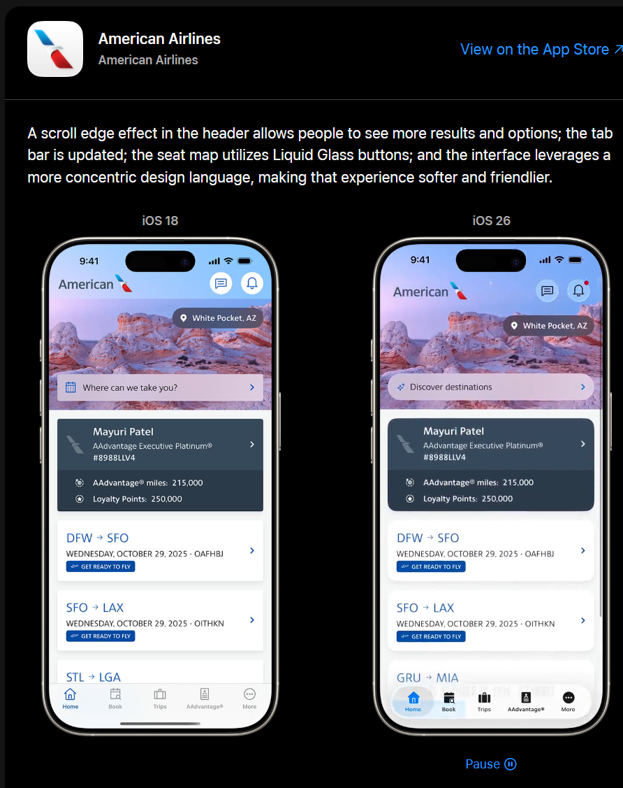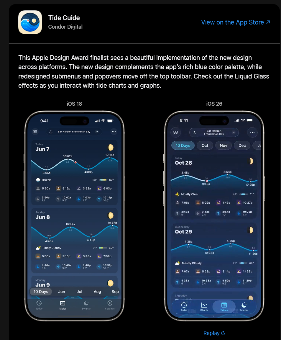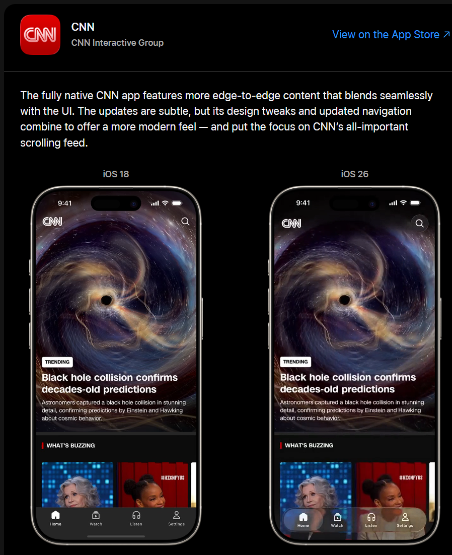 ในแกลเลอรี Apple ได้เปรียบเทียบดีไซน์ของแอปต่าง ๆ ระหว่างเวอร์ชัน iOS 18 และ iOS 26 เพื่อให้เห็นความเปลี่ยนแปลงอย่างชัดเจน เช่น: