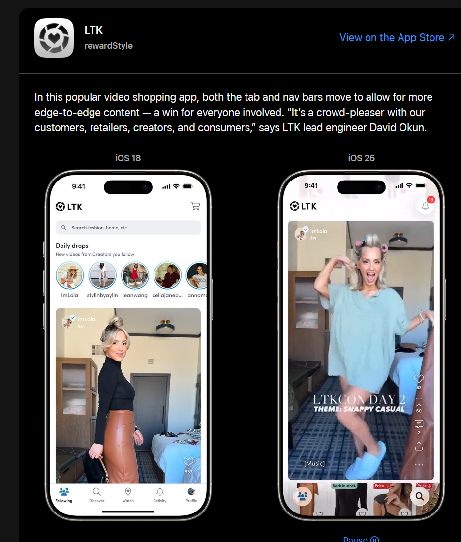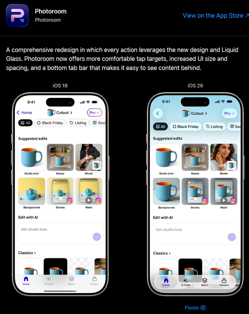 Apple ระบุว่า “ทีมทุกขนาด” สามารถนำดีไซน์นี้ไปใช้ได้ และแนะนำให้นักพัฒนาเข้าไปดูตัวอย่างบนเว็บไซต์เพื่อรับแรงบันดาลใจในการออกแบบแอปยุคใหม่