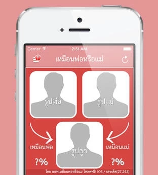 แอพพลิเคชั่น น่ารักๆ เอาไว้แชร์ผ่าน Social ที่กำลังเป็นกระแส คนกำลังฮิตเลยครับ กับแอพฯ Like father or like mother หรือ “หน้าเหมือนพ่อหรือเหมือนแม่” ที่เราสามารถใส่ภาพหน้าของพ่อและแม่ และภาพของลูก ไม่ว่าภาพที่เรานำเอามาใส่นั้นจะเป็นใครก็ตาม ตัวแอพพลิเคชั่นทำการ (เหมือน) วิเคราะห์ความคล้ายคลึงกันของโครงใบหน้า และแจ้งเปอเซ็นต์ความคล้ายคลึงของลูกว่า หน้าตาคล้ายคุณพ่อหรือแม่มากกว่ากันครับ
