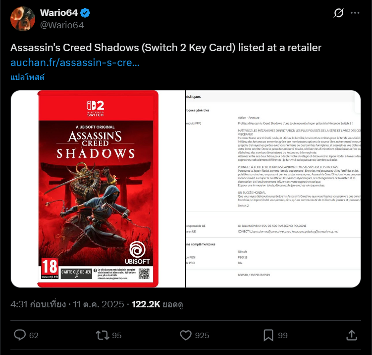 มีรายงานจาก GameRant ว่าเวอร์ชัน Assassin’s Creed Shadows สำหรับ Switch 2 ได้รั่วไหลออกมาผ่านดีลเลอร์รายหนึ่ง โดยปรากฏในรายชื่อสินค้าพรีออเดอร์พร้อมภาพหน้าปก โดยผู้ใช้ X ที่ชื่อ @Wariod64 ได้โพสต์ภาพของกล่องเกมและทะเบียน PEGI ใน X