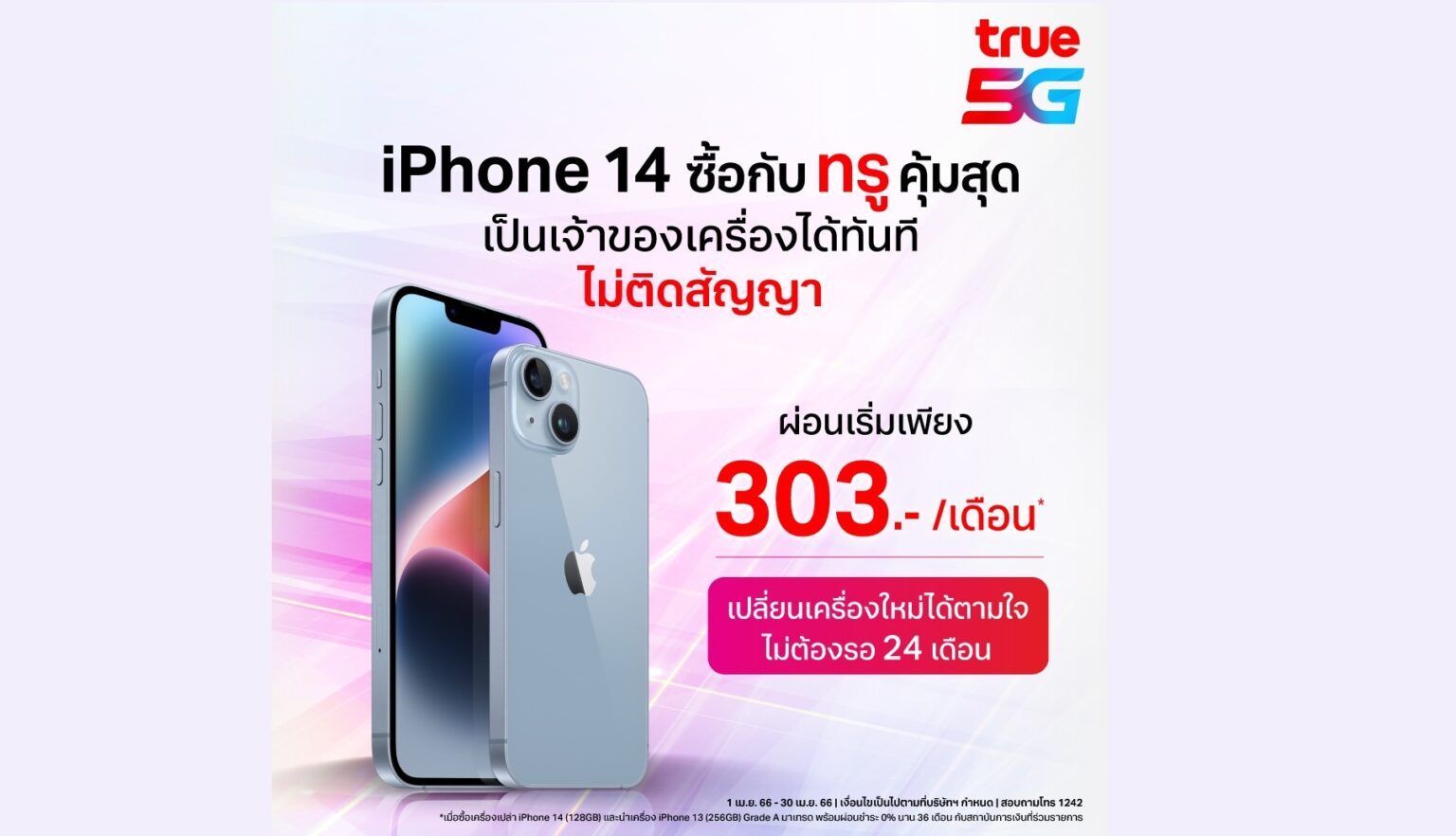 รายละเอียดแคมเปญ iPhone 14 128 GB ในราคาผ่อนเริ่มเดือนละ 303 บาทต่อเดือน แบบไม่ติดสัญญา จะเป็นสิทธิพ…