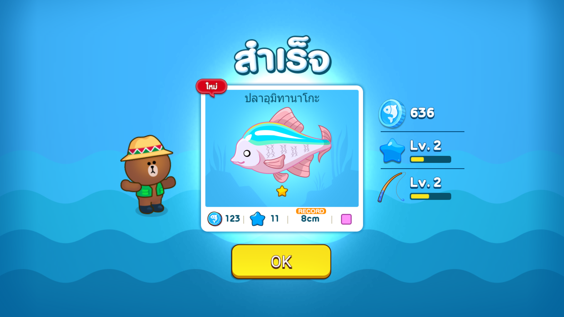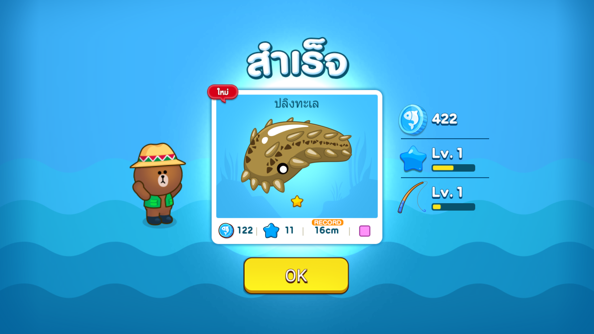 ในที่สุดก็จับปลาตัวแรกได้ หน้าตาไม่โอเครที่จะเป็นปลาตัวแรกของเราเท่าไหร่ แต่ก็ดีใจที่จับมันได้ ก็จะไปปรากฏอยู่ในคอเล็กชั่นปลาของเรา