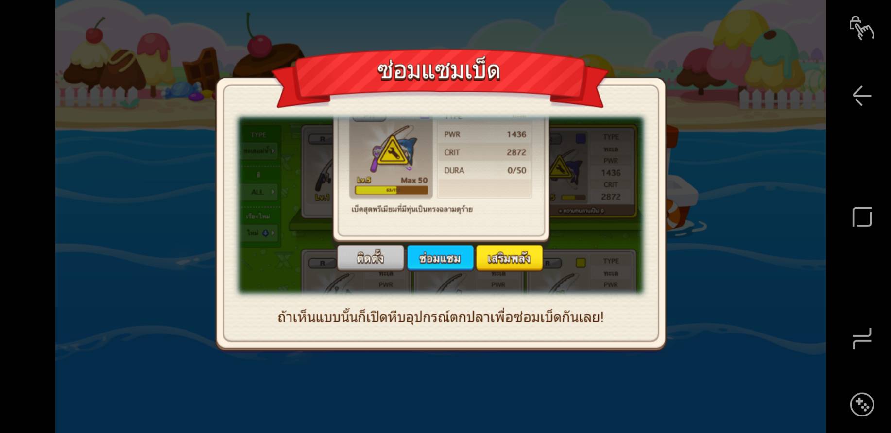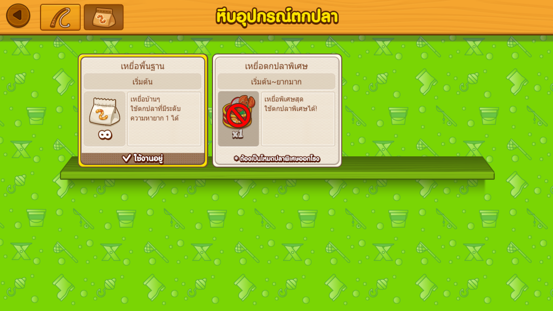 ตัวเบ็ดตกปลา ใช้บ่อยๆนอกจากจะเป็นการเพิ่มเลเวลแล้วยังเสียหายได้อีกด้วย เมื่อใช้งานจนถึงขั้นซ่อมแซมจะทำให้จับปลายากขึ้นด้วยต้องทำการซ่อม โดยจะมีสัญลักษณ์เป็นรูปสามเหลี่ยมสีเหลืองเตือนให้ทำการซ่อมแซม ซึ่งตัวเบ็ดสามารถเสริมพลังได้โดยจะมีการเพิ่มเหยื่อ ซึ่งตอนนี้ยังเพิ่มไม่ได้ คาดว่าน่าจะเพิ่มได้เมื่ออัพเลเวลเกินเลเวล 10 ขึ้นไป เพราะนี่ยังเป็นเกาะแรกๆ อยู่ อาจจะยังไม่มีอะไรมาก