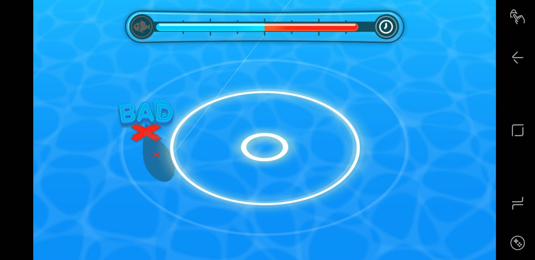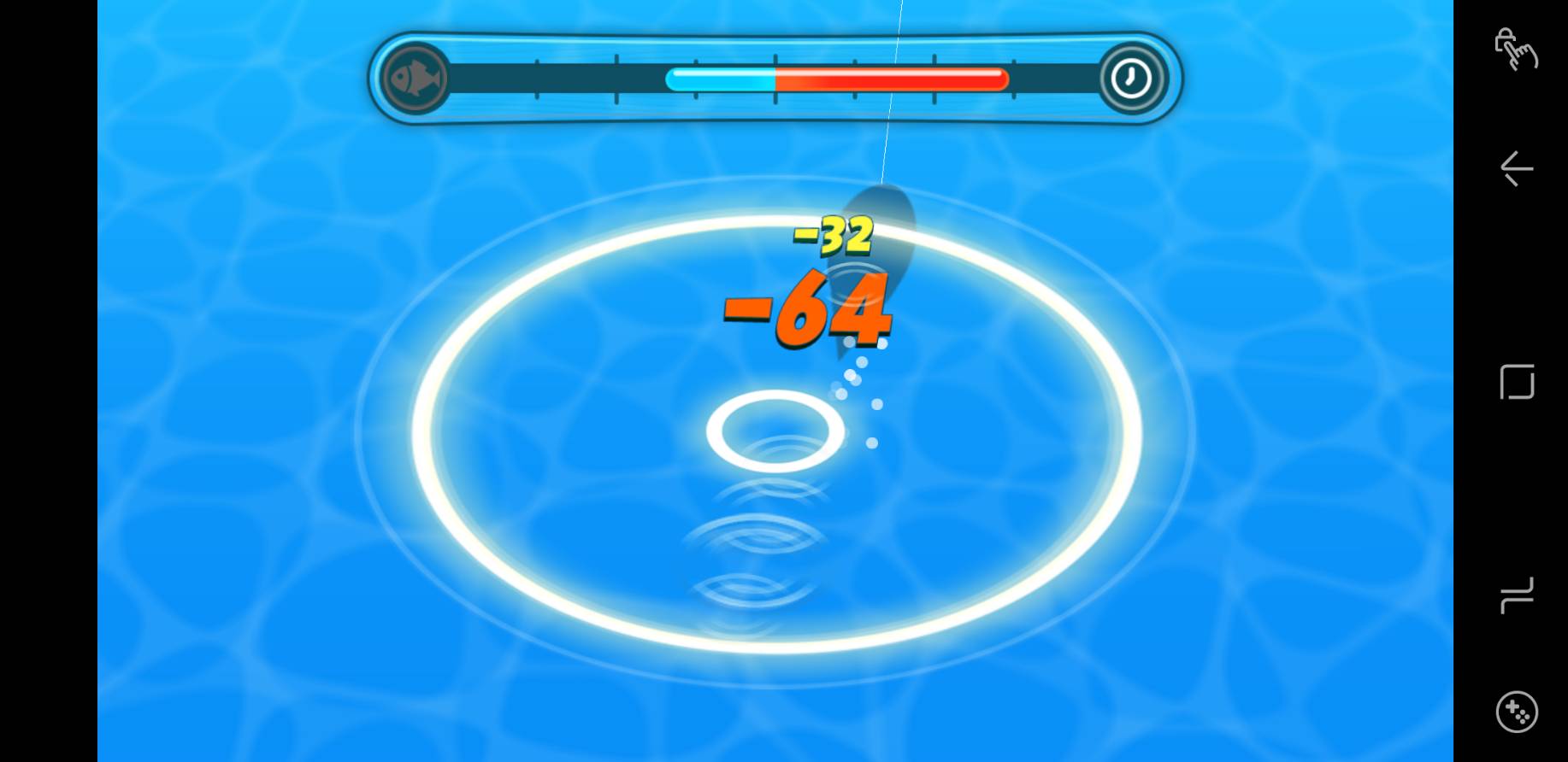 วิธีตกปลาก็คือ ให้แท็ปที่หน้าจอเวลาเห็นเงาของปลาว่ายเข้าไปในวงกลม แตะถี่ๆ ให้ติดลบสีเหลืองเยอะๆ โดยเฉพาะวงกลมตรงกลางจะติดลบสีแดงเป็นเท่าตัวของสีเหลือง เพื่อให้แถบค่าพลังสีฟ้าด้านบนลดลงจะได้จับได้เร็วๆ ยิ่งอัพเลเวลเบ็ดค่าพลังของเบ็ดก็จะเพิ่มขึ้น ทำให้จับได้ง่ายขึ้น จับให้ได้ก่อนแทบเวลาสีแดงด้านบนลด ไม่อย่างนั้นปลาจะหลุดและหนีไป