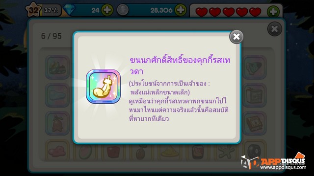 - สมบัติขนนกศักสิทธิ์ของคุกกี้รสเทวดา : ได้มาจากการอัพเกรดคุ๊กกี้นางฟ้าให้ถึงระดับ 8 มีผลให้ผู้สวมใส่มีพลังแม่เหล็กดูดสิ่งของได้ไม่ต่างจากคุ๊กกี้นางฟ้า โดยเฉพาะเมื่อตีบวกสมบัติไปจนถึงระดับ 9