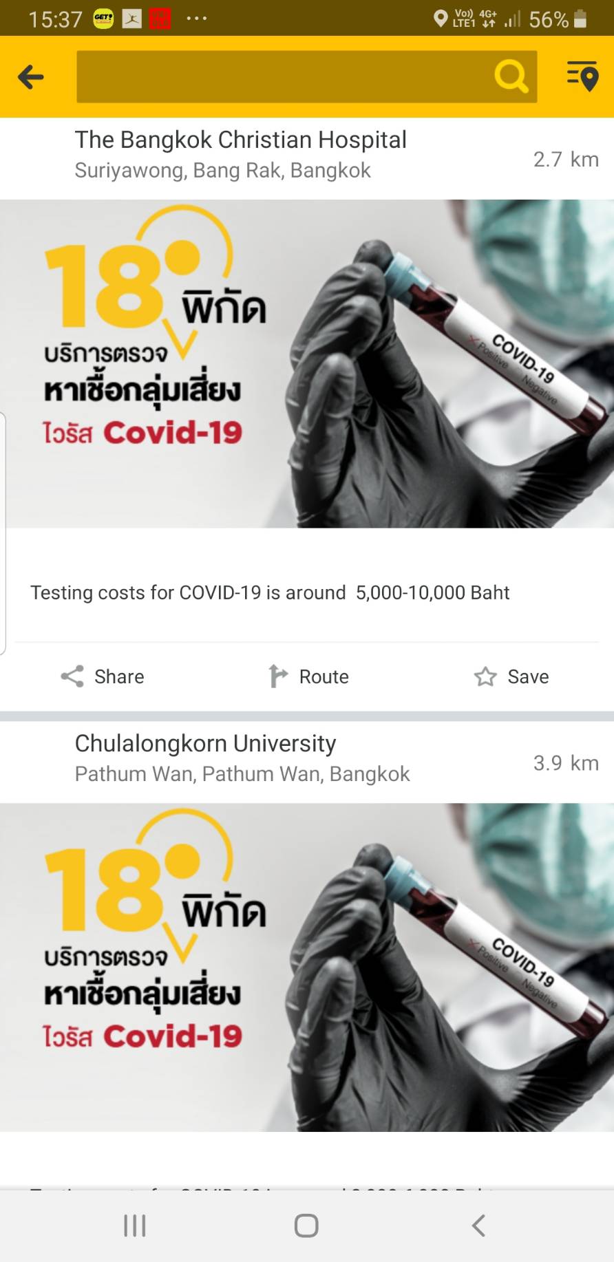 แอปพลิเคชันแผนที่นำทาง โดยบริษัท โกลบเทค จำกัด ร่วมฝ่าวิกฤติ COVID-19 จัดทำแผนที่พิเศษแสดงตำแหน่งสถานพยาบาลในเขตกรุงเทพ และปริมณฑล ที่มีความพร้อมรับตรวจหาเชื้อไวรัสโคโรนาหรือโรคโควิด-19 บริการประชาชน สำหรับประชาชนกลุ่มเสี่ยง โดยสามารถตรวจสอบค่าใช้จ่ายเบื้องต้นของแต่ละโรงพยาบาลเพิ่มเติมได้ในแอพพลิเคชัน