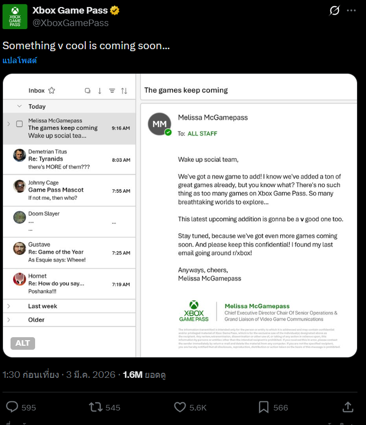 ก่อนหน้านี้ Xbox Game Pass เคยใช้รูปแบบอีเมลล้อเลียนในลักษณะเดียวกันเพื่อใบ้ถึงเกมใหม่ และมักประกาศอย่างเป็นทางการภายในเวลาไม่นานหลังโพสต์คำใบ้ ทำให้หลายฝ่ายคาดว่าอาจมีการยืนยันในเร็วๆ นี้
