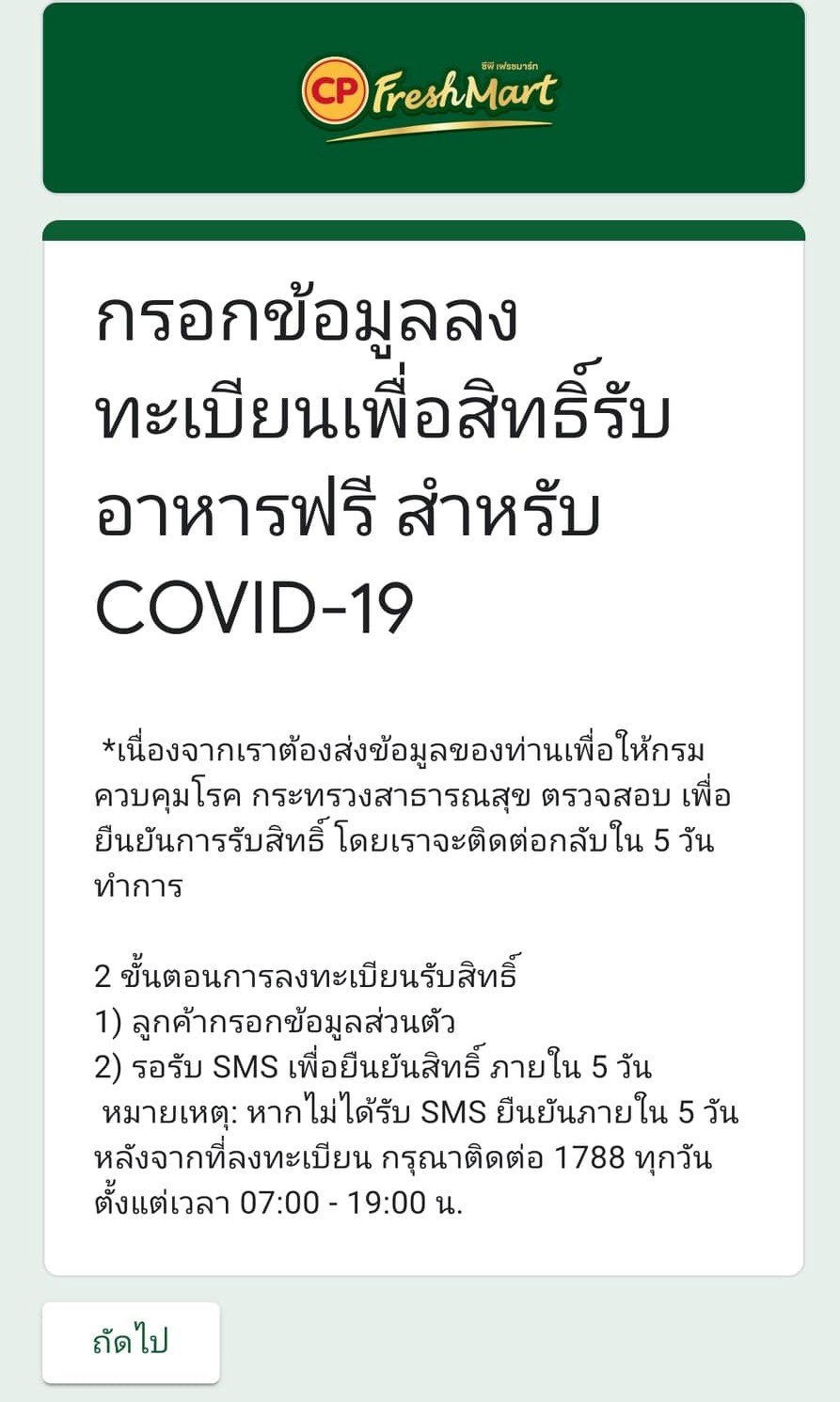 และอีกช่องทางกรอกข้อมูลลงทะเบียนเพื่อสิทธิ์รับอาหารฟรี สำหรับ COVID-19 เข้าไปลงทะเบียนผ่านทางลิงก์ที่นี่ค่ะ >> ลงทะเบียนกับซีพี