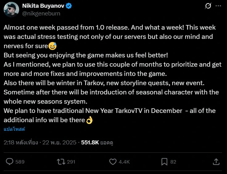 แม้จะเจออุปสรรคช่วงเปิดตัว แต่บูยานอฟยืนยันว่าตลอดช่วงเวลาที่เหลือของปี 2025 ทีมงานจะมุ่งเน้นการแก้บั๊ก ปรับปรุงคุณภาพการเล่น และเพิ่มเติมคอนเทนต์ใหม่เข้าสู่เกม เขาระบุว่าจะมีฤดูหนาวในเมืองทาร์คอฟ เควสต์เนื้อเรื่องใหม่ และอีเวนต์พิเศษ รวมถึงรายการประจำปีอย่าง New Year TarkovTV ในเดือนธันวาคมที่ผู้เล่นหลายคนตั้งตารอ