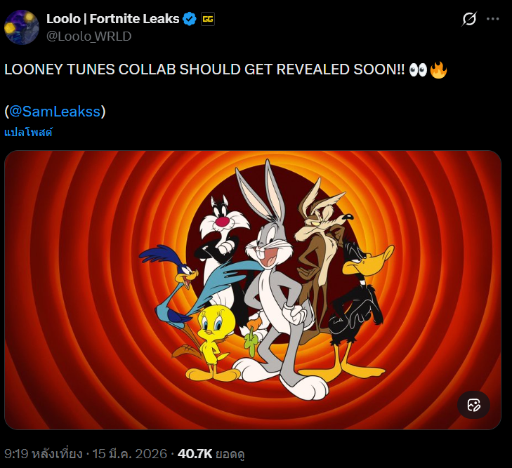 Epic Games อาจกำลังเตรียมเพิ่มคอนเทนต์คอลแลบใหม่ให้กับ Fortnite อีกครั้ง หลังมีข้อมูลหลุดระบุว่าเกม Battle Royale ชื่อดังอาจร่วมมือกับแฟรนไชส์การ์ตูนระดับตำนานอย่าง Looney Tunes โดยการคอลแลบครั้งนี้ยังไม่ได้รับการประกาศอย่างเป็นทางการ แต่มีรายงานว่าอาจเปิดเผยรายละเอียดภายในไม่กี่วันข้างหน้า