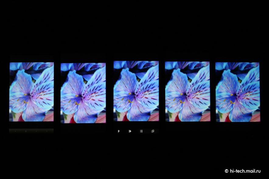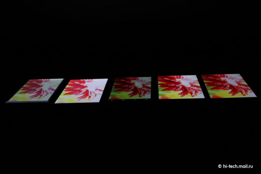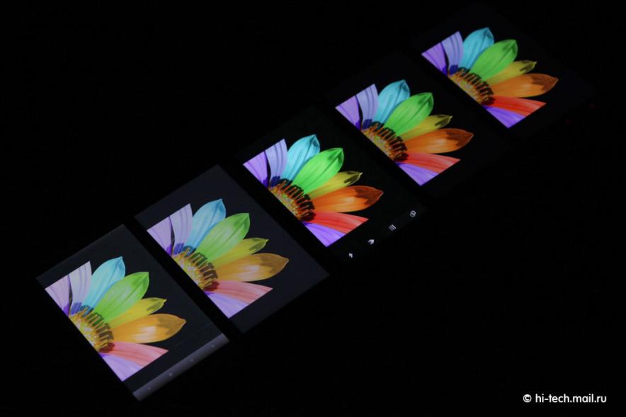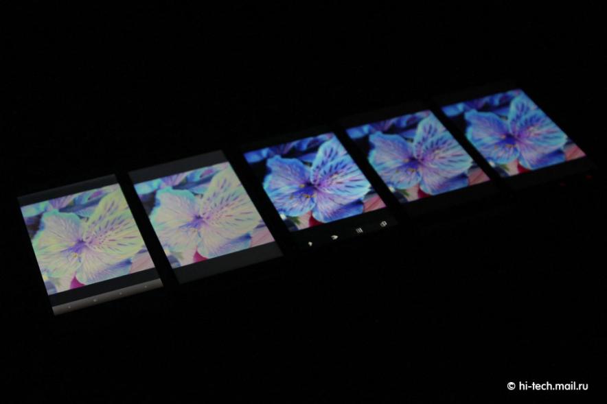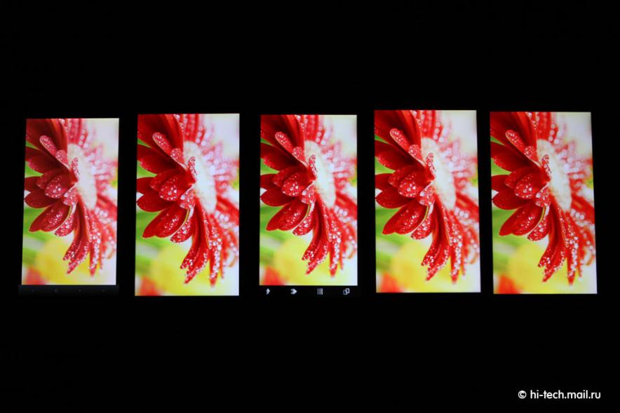 สำหรับการแสดงผลภาพของแต่ละรุ่นนั้นดูไม่แตกต่างกันมากแต่ถ้าจะวัดผล contrast ratio หรือคือ อัตราส่วน สีดำที่ดำที่สุดและสีขาวที่ขาวที่สุด ที่เจ้าไหนมีค่า contrast ratio สูงๆ จะแสดงภาพได้ดูลึกมีมิติสมจริงโดยวัดผล contrast ratio ของ HTC และ OPPO อยู่ที่ 1100:1, Sharp SH930W 900:1, Sharp Zeta 800:1 Sony Xperia Z 570:1 หรือกล่าวคือ HTC และ OPPO สามารถแสดงผลภาพได้สมจริงมากที่สุด
