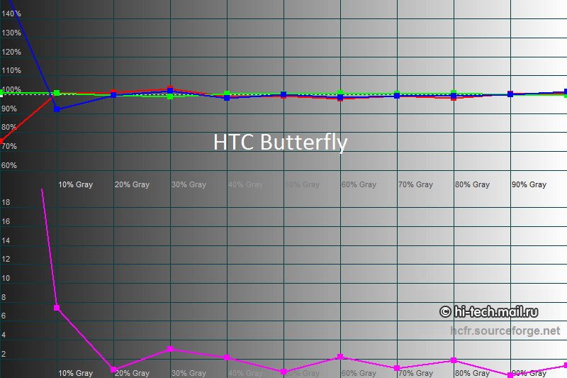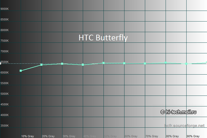 HTC Butterfly มีค่าเฉลี่ยอยู่ที่ 2.08 ซึ่งค่าเฉลี่ยต่ำกว่ามาตรฐานที่ 2.2 ทำให้สีออกโทนสว่างไปเล็กน้อย