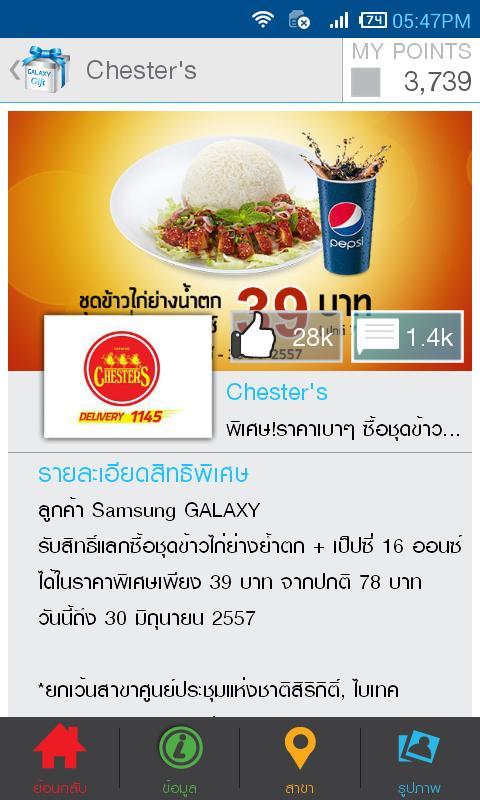 วันนี้เป็นวันหยุดงานของแอดมินครับก็เลยถือโอกาสไปเดินห้างใช้สิทธิ์ Galaxy Gift ในสมาร์ทโฟนของทาง Samsung ซะหน่อย วันนี้มีโปรโมชั่นพิเศษที่จะมาแนะนำกันครับนั่นก็คือ ชุดข้าวไก่ย่างน้ำตก+เป๊ปซี่ ได้ในราคาพิเศษ 39บาทเท่านั้น เจ๋งงงงงงงงงง เรียกได้ว่าประหยัดเงินได้มากเลยครับแค่นี้ก็อิ่มได้สบายมากๆ มาดูรายละเอียดกันตามรูปครับ