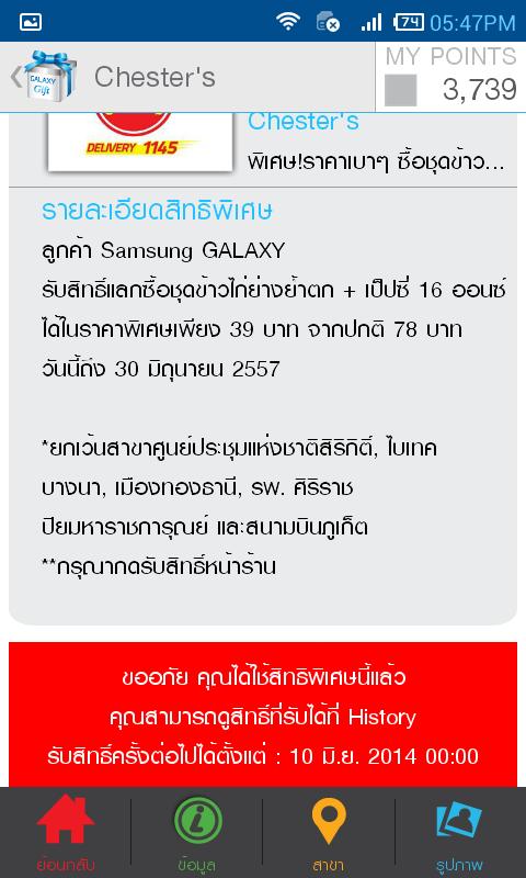 ลูกค้า Samsung Galaxy รับสิทธิ์แลกซื้อชุดข้าวไก่ย่างน้ำตก + เป๊ปซี่ 16 ออนซ์ ได้ในราคาพิเศษเพียง 39บาท จากปกติ 78บาท วันนี้ถึง 30 มิถุนายน 2557