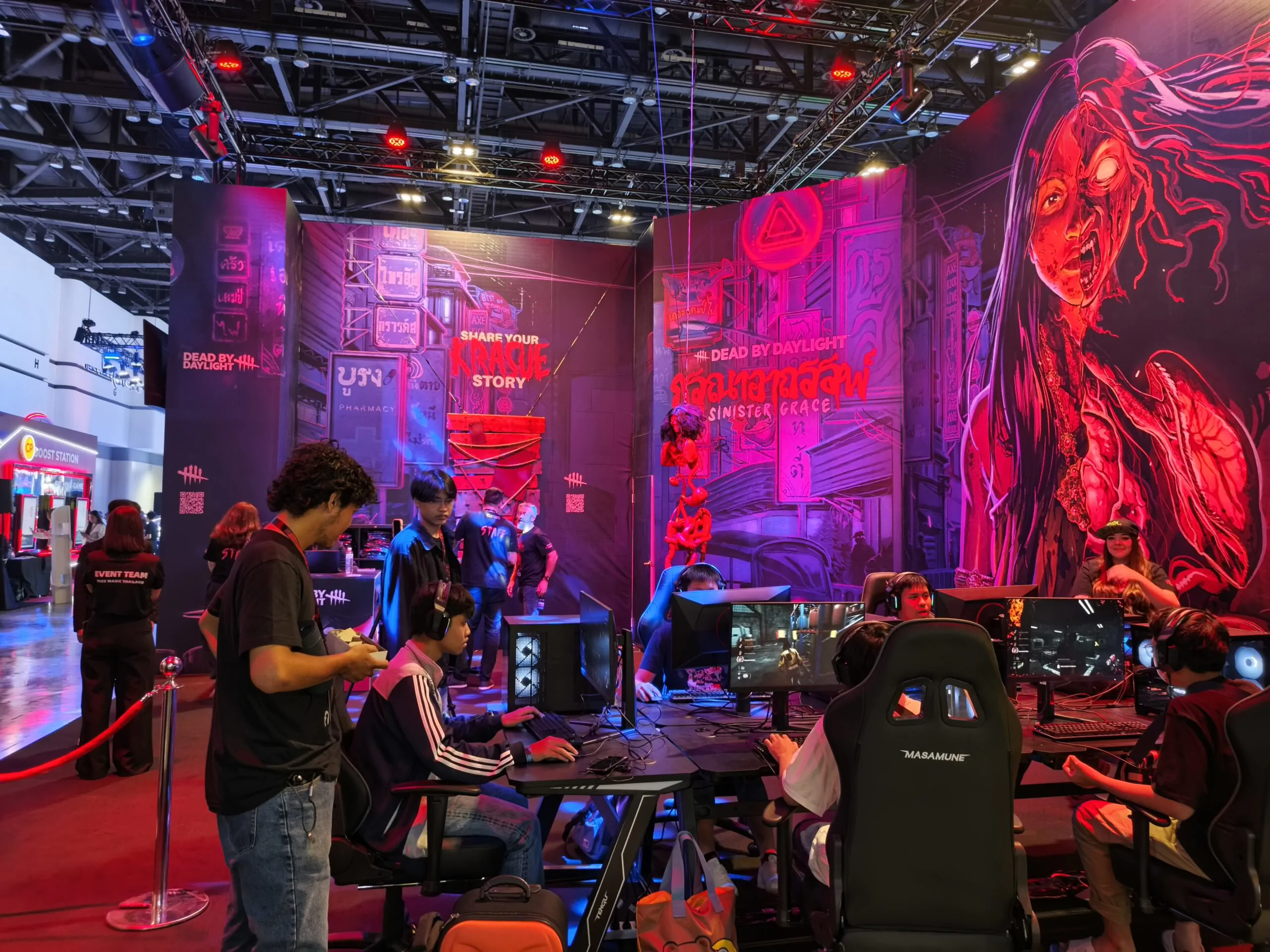 และอีกหนึ่งของเด็ดคือบูธ Dead By Daylight ที่เอากระสือมาตกแต่งซะดูทั้งเท่ทั้งน่ากลัวพร้อมให้เราสามารถไปเล่นได้ 5 เครื่องนั่งเล่นกันใต้กระสือเลย