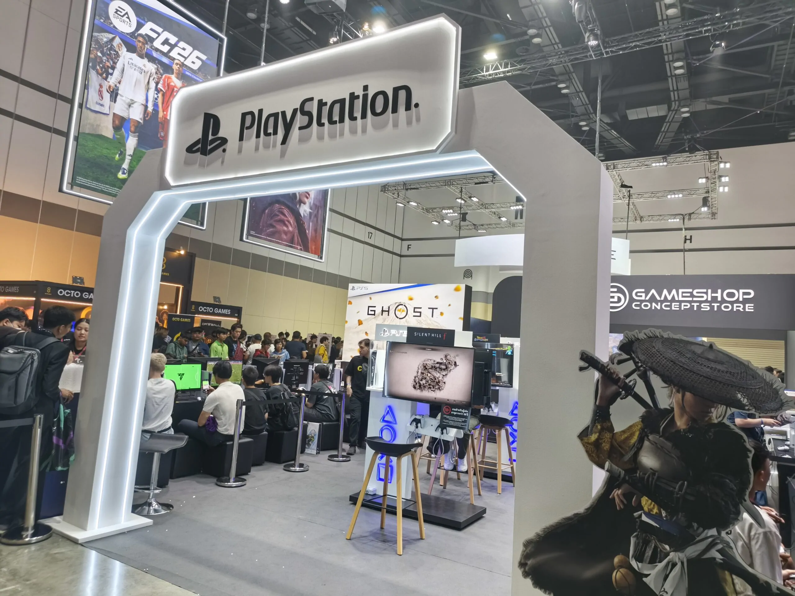และยังมีบูธ PlayStation ที่จะให้เราได้ทดลองเล่นเกมผ่านจอยและเครื่อง Playstation 5 เช่น Astrobot หรือจะเป็น Ghost Of Yotei หรือแม้แต่เกมที่ยังไม่วางขายอย่าง Resident Evill Requiem ก็มีให้ลอง!