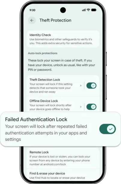 Android เพิ่มตัวเลือกควบคุม Failed Authentication Lock แยกเป็นสวิตช์เฉพาะ ผู้ใช้กำหนดระดับความเข้มงวดได้เอง หากมีการใส่ PIN หรือรูปแบบผิดหลายครั้ง ระบบจะเพิ่มเวลาหน่วงการลองใหม่ ทำให้การเดาสุ่มแทบเป็นไปไม่ได้ แต่ในขณะเดียวกันก็ออกแบบให้ไม่ล็อกเจ้าของเครื่องโดยไม่ตั้งใจ เช่น กรณีเด็กกดผิดซ้ำ ๆ แบบเดิม ระบบจะรู้ว่าไม่ใช่ความพยายามในการเดาสุ่ม