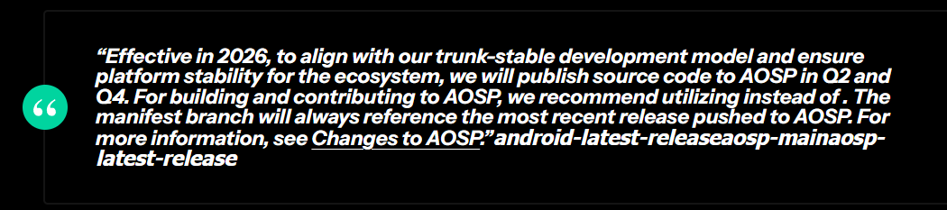 Google ยืนยันอย่างเป็นทางการว่าจะปรับตารางการปล่อยซอร์สโค้ด Android ไปยัง Android Open Source Project (AOSP) จากเดิมที่มีการอัปเดตรายไตรมาส 4 ครั้งต่อปี เหลือเพียง 2 ครั้งต่อปี คือในช่วงไตรมาส 2 (Q2) และไตรมาส 4 (Q4) โดยจะเริ่มมีผลตั้งแต่ปี 2026 เป็นต้นไป