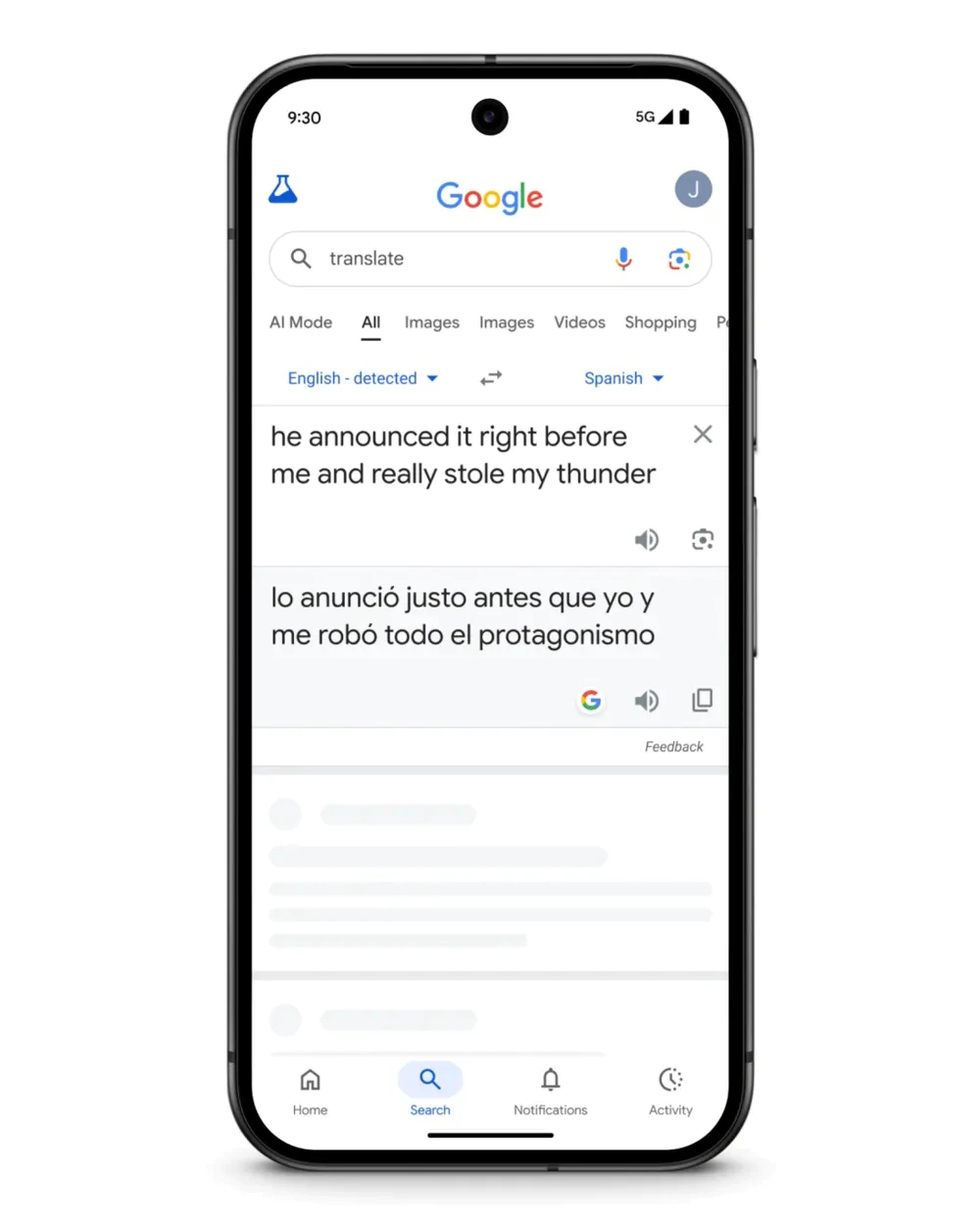 การอัปเดตครั้งนี้เริ่มต้นด้วยการปรับปรุงคุณภาพการแปลข้อความ โดย Gemini สามารถเข้าใจความหมายเชิงลึกของวลีหรือสำนวนที่มีนัยซ่อน เช่น idiom หรือภาษาพูดที่ไม่ตรงตัว ตัวอย่างเช่นการแปลสำนวนภาษาอังกฤษ “stealing my thunder” ซึ่งเดิมอาจถูกแปลตรงตัว แต่ตอนนี้ Gemini จะตีความและให้คำแปลที่ตรงกับความหมายจริงมากกว่า การอัปเดตนี้เริ่มเปิดให้ใช้งานแล้วในสหรัฐฯ และอินเดีย รองรับการแปลระหว่างภาษาอังกฤษกับอีกเกือบ 20 ภาษา เช่น สเปน ฮินดี จีน ญี่ปุ่น และเยอรมัน ทั้งบนแอป Translate (Android และ iOS) และบนเว็บ