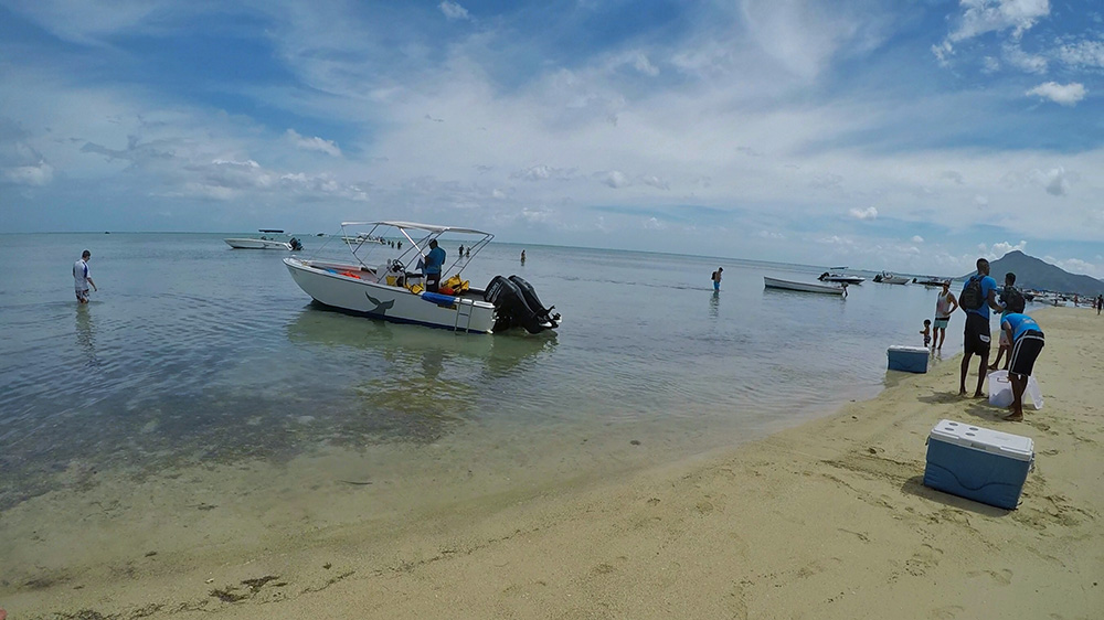 จาก Flic-en-Flac เดินทางไปท่าออกเรือที่ Trou d’Eau Douche ต้องใช้เวลาประมาณ 2 ชั่วโมงเลยทีเดียวครับ ยิ่งกับตอนเช้าที่การจราจรติดขัดแบบนี้ก็ยิ่งนาน โดย Flic-en-Flac นั้นอยู่ทางตะวันออกของประเทศ ในขณะที่ Trou d’Eau Douche นั้นอยู่ทางตะวันตกของประเทศ และจะเป็นจุดปล่อยเรือไปยังเกาะ Ile Aux Cerfs กว่ารถตู้จะมารับพวกเราก็ประมาณ 8 โมงเช้าแล้ว กว่าจะเดินทางไปถึงท่าที่ Trou d’Eau Douche ก็ปาไปสิบโมงเกือบๆ ครึ่ง จากนั้นก็ฟังบรีฟความปลอดภัยและแผนการเดินทางวันนี้กันหน่อยหนึ่งก่อนจะลงเรือไปยัง Ile Aux Cerfs ซึ่งใช้เวลาประมาณ 15 นาทีจาก Trou d’Eau Douche ครับ