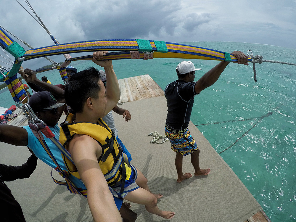 แม้ว่าตอนเช้าและตอนนั่งเรือมา Ile Aux Cerfs นั้นฟ้าจะไม่ค่อยโปร่งจนแอบกลัวว่าจะไป Parasailing ไม่ได้หรือได้ก็ไม่สวย แต่พอถึง Ile Aux Cerfs เท่านั้นล่ะครับ ความกังวลหายหมดเลย เพราะว่าแดดออกฟ้าใสให้เลยทีเดียว เห็นแบบนั้นก็ไปเสียตังค์ 3000MUR เพื่อทำ Parasailing ครับ ป่ะ ไป Parasailing กัน!