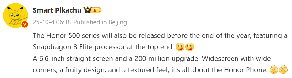 รายงานจากแหล่งข่าวในจีนอย่าง Smart Pikachu เผยว่า HONOR กำลังพัฒนาโทรศัพท์ใหม่หลายรุ่นสำหรับตลาดในประเทศจีน ทั้งซีรีส์ Magic 8, GT 2 และ HONOR 500 โดยรุ่นหลังสุดนี้อาจเปิดตัวภายในเดือนธันวาคม 2025