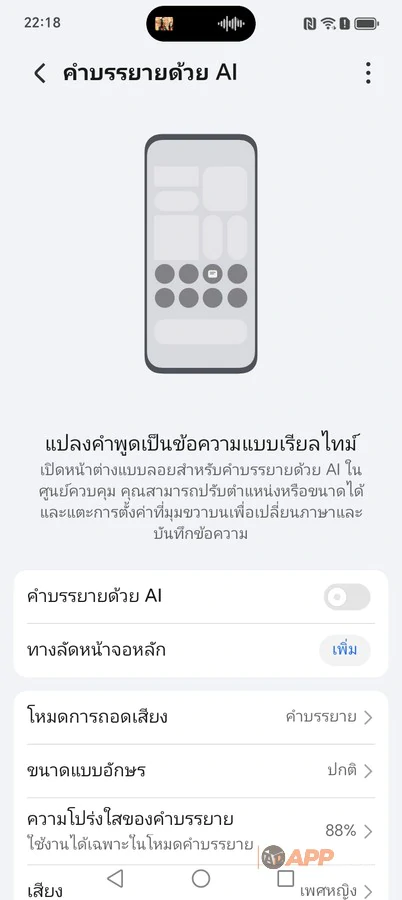 - ด้าน AI Subtitles ถูกออกแบบมาเพื่อช่วยถอดเสียงและสร้างคำบรรยายอัตโนมัติจากวิดีโอหรือคอนเทนต์ที่ไม่มีซับ ทำให้การดูวิดีโอในสถานการณ์ที่ไม่สามารถเปิดเสียงได้สะดวกขึ้น รวมถึงช่วยให้เข้าใจเนื้อหาที่เป็นภาษาต่างประเทศได้ง่ายกว่าเดิม