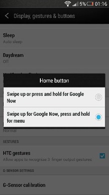 การอัพเดทครั้งนี้จะยังคงอยู่กับหน้าโฮม UI ชื่อเดิมคือ Sense 5 แต่ Minor Change ไปเล็กน้อย ซึ่งก็น่าจะเป็นเช่นนั้น เพราะ UI ตัวนี้ก็เพิ่งมีออกมาให้ใช้กันไม่นานนี้เองแหละครับ อย่างแรกที่จะเพิ่มเติมเข้ามานั้นก็คือ ทางเลือกในการสั่งงานผ่านปุ่มโฮมของเครื่อง ซึ่งตามปกติ การทัชค้างที่ปุ่มโฮมของตัวเครื่องจะเป็นการเรียกใช้งาน Google Now ออกมา แต่ในเวอร์ชั่นใหม่ เราสามารถเลือกให้เป็นการเรียกใช้งานปุ่ม “เมนู” ได้แทนแล้วครับ เพราะโดยปกติ เครื่องของทาง HTC ในระยะหลังๆ มักจะทำปุ่มเมนูหายไปจากทัชคีย์ด้านล่าง (ไม่รู้ไปทำหายไว้แถวไหน) แต่ตอนนี้สามารถเลือกใช้งานปุ่มโฮมให้เป็นปุ่มเมนูได้แล้ว และคงการเรียกใช้ Google Now โดยการ Swipe นิ้วขึ้นแทน