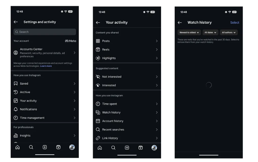 ดูประวัติ Reels ที่เคยชมผ่านบัญชีของตนเอง