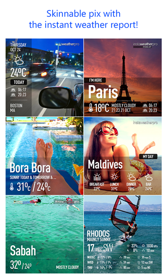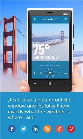 ในที่สุด App สุดดังในช่วงนึงที่เคยเป็นกระแสใน IOS กับ Android ที่ใช้ถ่ายรูปพร้อมบอกสภาพอากาศให้เพื่อนรู้ ก็มาลง Window Phone แล้วนะ มันคือ InstaWeather Pro สาวกผลไม้กับหุ่นเขียวได้ยินชื่อคงร้องอ๋อแน่ๆ เพราะคงเคยได้ลองใช้กันมาก่อนแล้ว รวมทั้งผมเองก็ด้วย มันสามารถถ่ายรูปที่ไหนก็ได้บนโลกนี้ แล้วก็มีโชว์สภาพอากาศในขณะนั้นให้เพื่อนๆรู้ แล้วแชร์ผ่าน social ต่างๆเช่น Facebook / Instagram / Twitter / Foursquare ได้ มันยังสามารถเปลี่ยนกรอบที่โชว์สภาพอากาศได้ด้วย ให้เป็นแบบไหนก็ได้ มีหลายแบบให้เลือก