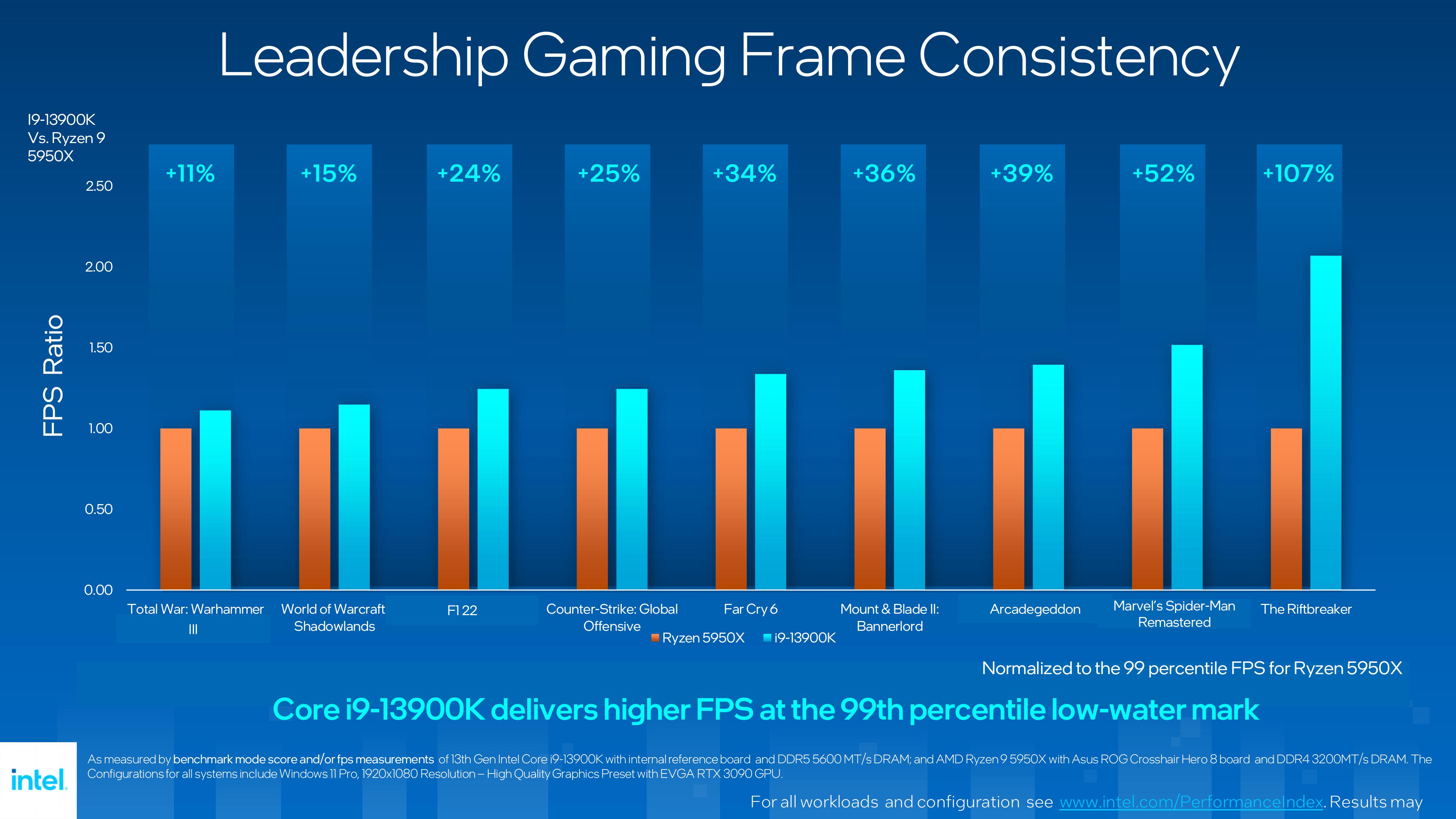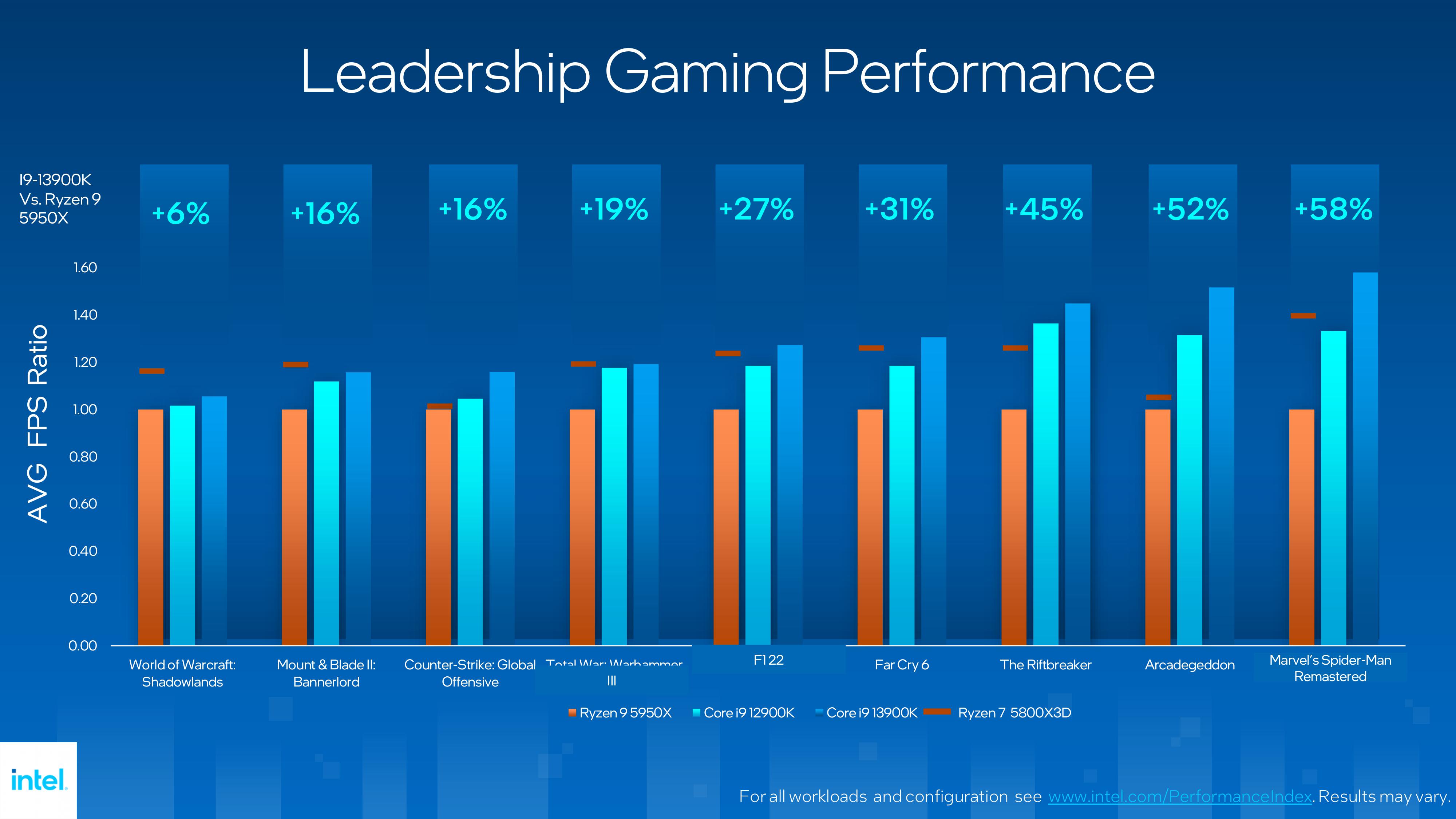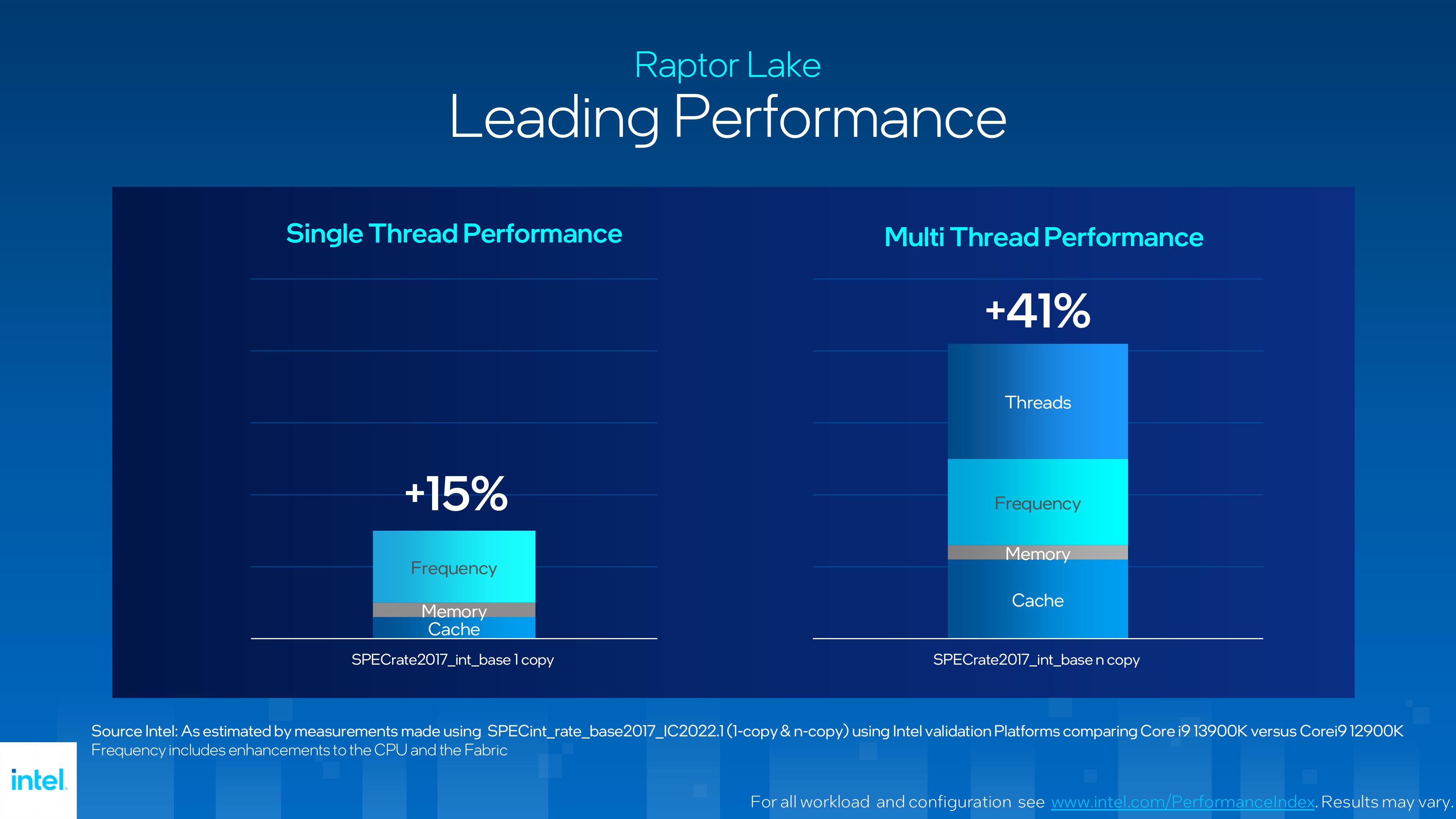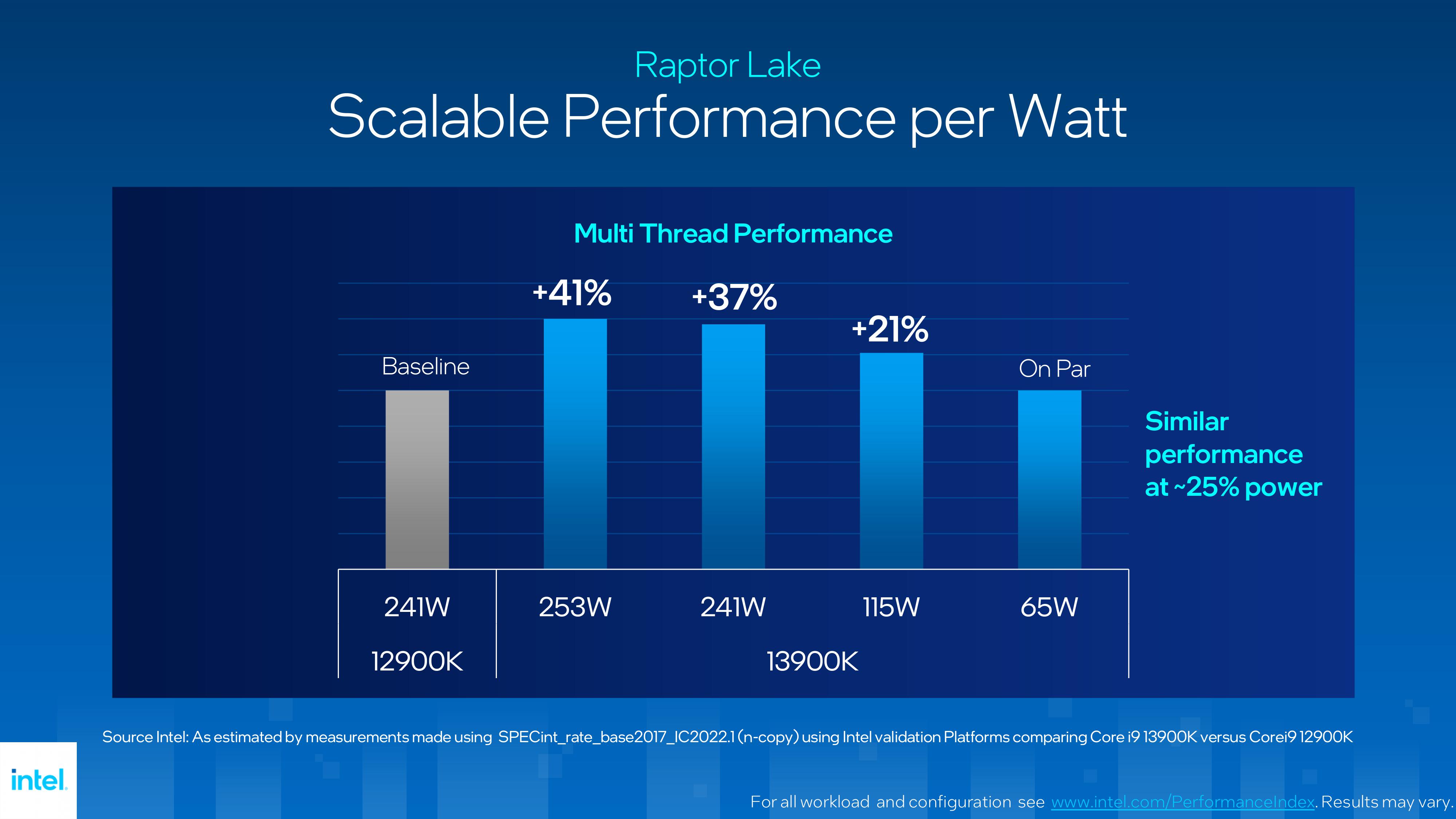 แน่นอนว่าทาง Intel ก็ออกมายืนยันว่าในเจเนเรชั่นที่ 13 นั้น Single Threads มีประสิทธิภาพดีขึ้นสูงสุด 15% และ Multi-Threads สูงสุดถึง 41% รวมมาพร้อมกับเมนบอร์ดชิปเซ็ต 700 Series อย่าง Z790 ที่มีการปรับจำนวนเลนของ PCIe 4 และเพิ่ม USB 3.0 Gen 2×2 20 Gbps เข้าไปด้วย ส่วนในด้านของการเล่นเกมนั้น Intel Core i9-13900K ประสิทธิภาพเทียบเท่า 12900K ในการใช้พลังงานเพียง 65W และเร็วกว่ามากถึง 37% หากใช้พลังงานที่ 241W เท่ากัน ทั้งเมนบอร์ดชิปเซ็ต Z790 และ Intel Core 13th Gen ที่เปิดตัวออกมาชุดแรก มีกำหนดวางขายอย่างเป็นทางการในวันที่ 20 ตุลาคม 2022 ใครสาวกค่ายฟ้าก็รอกันได้เลย