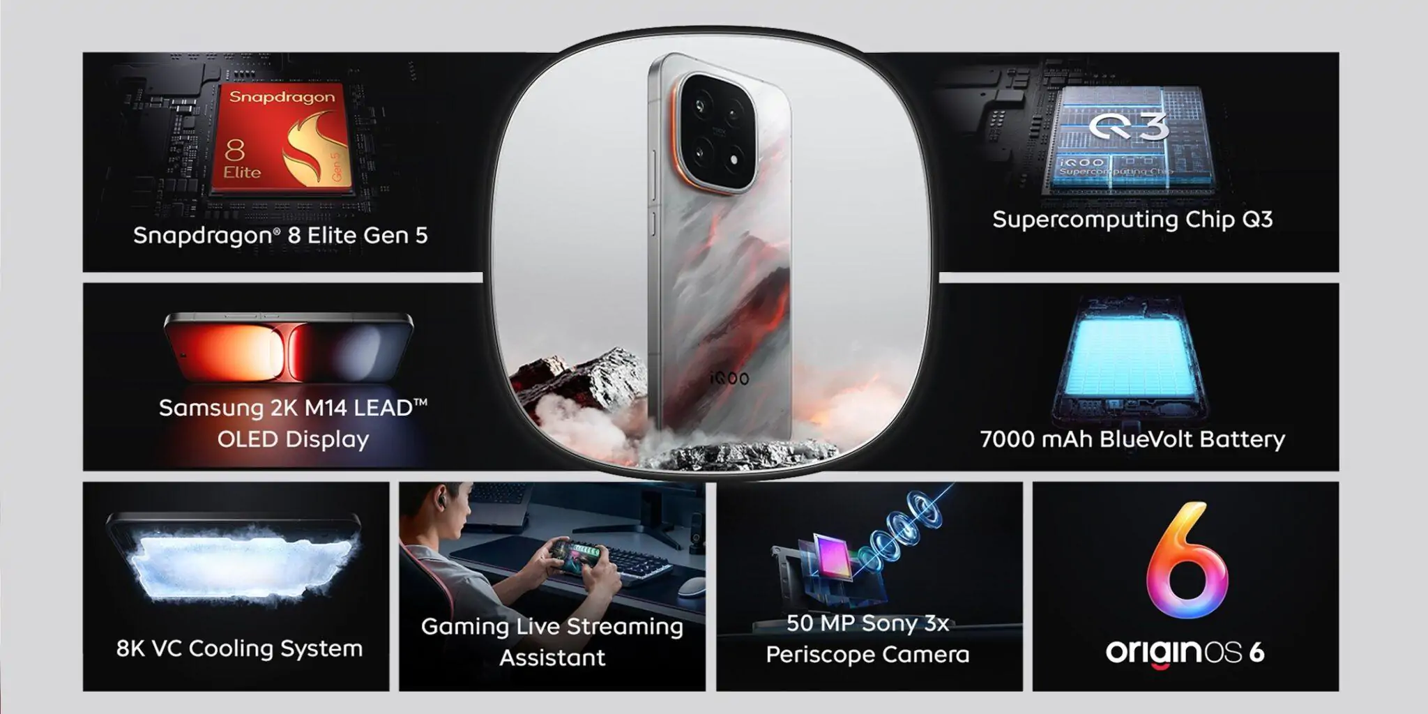 ด้านประสิทธิภาพใช้ชิป Snapdragon 8 Elite Gen 5 ขนาด 3 นาโนเมตร ทำงานร่วมกับ GPU Adreno 840 และชิปเกม Q3 เสริม โดยมีตัวเลือก RAM LPDDR5X Ultra ขนาด 12GB และ 16GB พร้อมความจุ UFS 4.1 สูงสุด 512GB รันบนระบบปฏิบัติการ Android 16 ครอบด้วย OriginOS 6.0