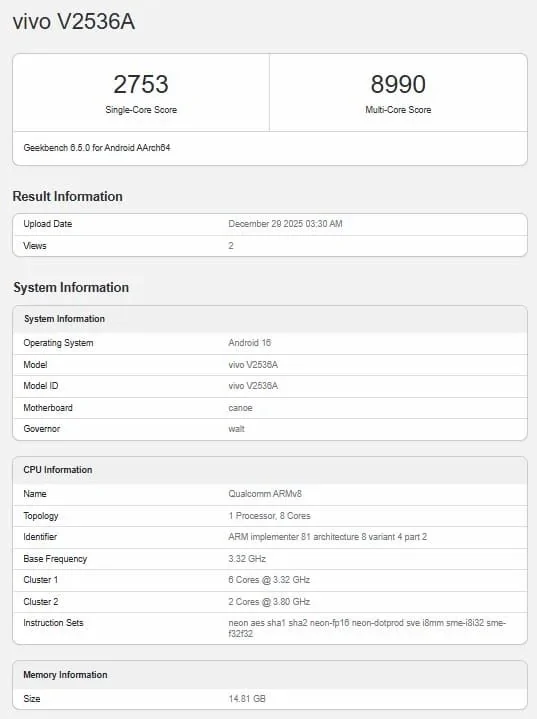 ก่อนหน้านี้ iQOO เพิ่งปล่อยภาพทีเซอร์โชว์ดีไซน์ฝาหลังของ Z11 Turbo ไปไม่นาน ล่าสุดมือถือรุ่นนี้ (โมเดล V2536A) ถูกพบในฐานข้อมูล Geekbench โดยข้อมูล CPU/GPU ระบุชัดว่ารุ่นนี้ใช้ Snapdragon 8 Gen 5 ซึ่งตรงกับที่ iQOO เคยยืนยันไว้ก่อนหน้า