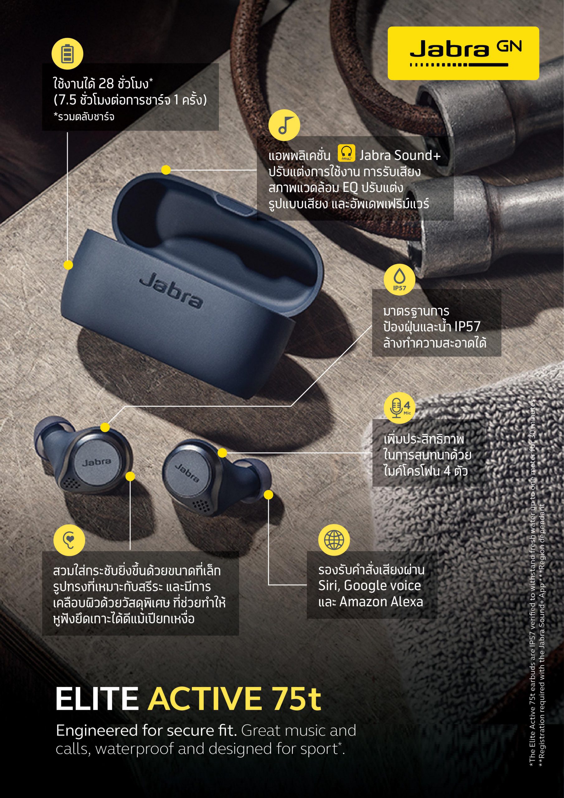 โดย Jabra Elite Active 75t เป็นหูฟังแบบ True Wireless ที่มาพร้อมกับคุณภาพเสียงที่คมชัด และแบตเตอรี่การใช้งานได้อย่างยาวนานกว่าเดิม ในดีไซน์ที่เล็กกระทัดรัดลง จึงทำให้คอเพลงสวมใส่ได้สบายและกระชับมากขึ้นขณะออกกำลังกาย ทั้งยังมีมาตรฐานกันฝุ่นและละอองน้ำได้ถึงระดับ IP57 ซึ่งสามารถกันน้ำเข้าได้ โดยน้ำลึกไม่เกิน 1 เมตร ในเวลาไม่เกิน 30 นาทีเลยทีเดียว นอกจากนั้น หูฟังยังเคลือบผิวด้วยวัสดุกันลื่นพิเศษ ที่ทำให้ใส่ได้กระชับแม้เปียกเหงื่อ