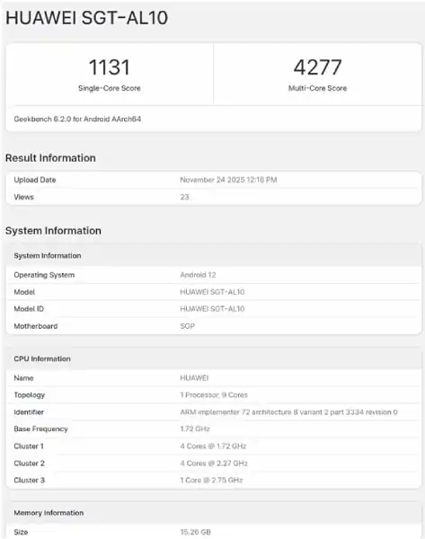 Mate 80 Pro Max ปรากฏบนฐานข้อมูล Geekbench พร้อมชิป Kirin 9030 และ RAM ขนาด 16GB โดยข้อมูลที่หลุดออกมานั้นเผยให้เห็นโครงสร้างภายในของชิปรุ่นใหม่อย่างละเอียด โดย Kirin 9030 ใช้โครงสร้าง CPU แบบ 1+4+4 รวมทั้งหมด 9 คอร์ ประกอบด้วยคอร์หลัก 1 คอร์ที่มีความเร็ว 2.75GHz, คอร์กลาง 4 คอร์ที่ความเร็ว 2.27GHz และคอร์เล็กอีก 4 คอร์ที่ความเร็ว 1.72GHz ส่วน GPU ใช้รุ่นใหม่ชื่อว่า Maleoon 935 ซึ่งเป็นการอัปเกรดจากรุ่นก่อนหน้า