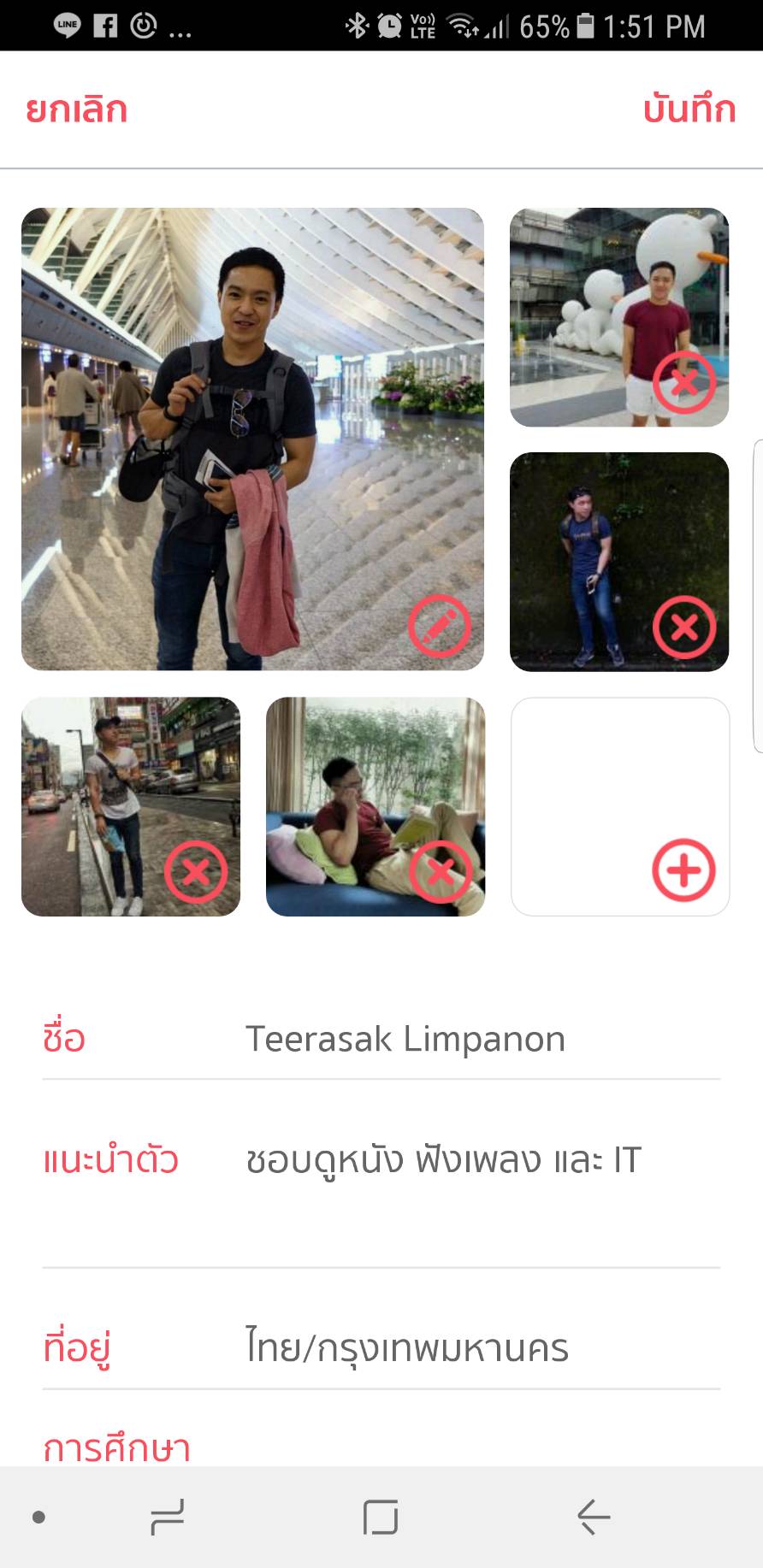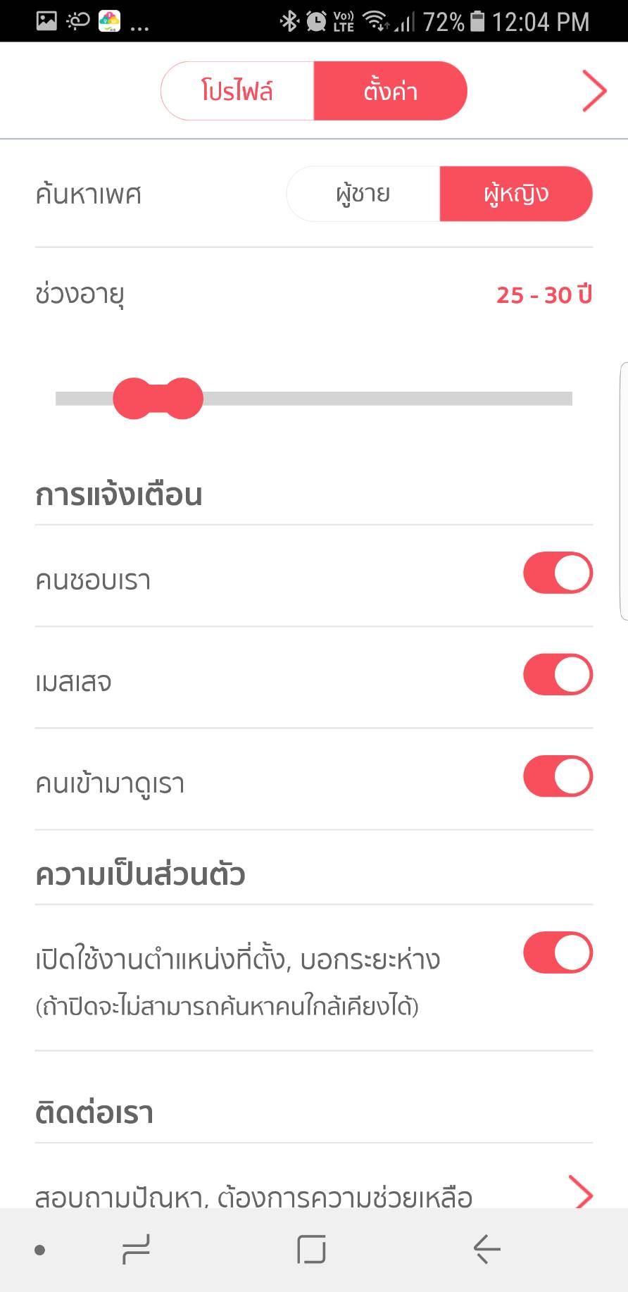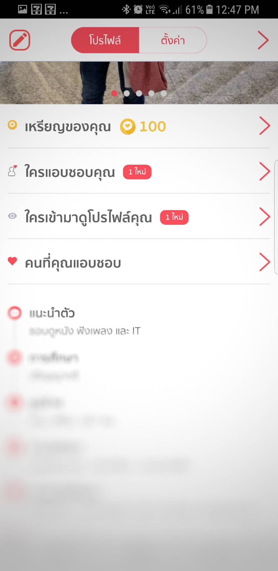 โปรไฟล์ส่วนตัว – หากเพื่อนๆ คลิกที่รูปภาพของตนเองจะปรากฏหน้าโปรไฟล์ส่วนตัวขึ้นมา โดยในหน้าโปรไฟล์ส่วนตัวนี้เพื่อนๆ สามารถเลือกแก้ไขประวัติและรายละเอียดของตน อัพเดตรูปภาพใหม่ (ซึ่ง ณ ปัจจุบันนี้สามารเพิ่มได้สูงสุด 6 ภาพและเลือก 1 ภาพจากในนั้นเป็นรูปภาพหลัก) รวมไปจนถึงการตั้งค่าการใข้งานส่วนตัวของตน ซึ่งในเมนูนี้เองที่เพื่อนๆ สามารถเลือกปรับตั้งคนที่ต้องการค้นหาได้ ทั้งเลือกเพศที่เราสนใจ และเลือกช่วงอายุที่เราอยากให้แอพพลิเคชั่นนี้แสดงขึ้นมาให้เราดูนั่นเอง