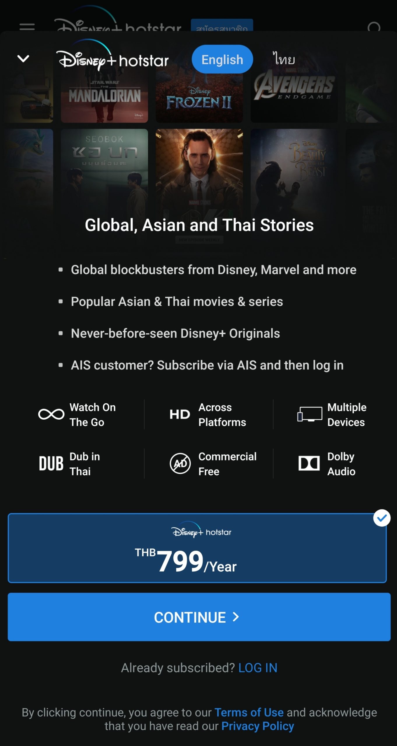 เริ่มที่สมัครใช้บริการ Disney+ Hotstar บนเครือข่าย 5G ด้วยแพ็กเกจพิเศษของ AIS 5G เดือนละ 49 บาท นาน 12 รอบบิล (จากราคาปกติเดือนละ 99 บาท) พร้อมรับสิทธิ์ชมเพิ่มอีก 1 เดือน จาก AIS สมัครได้ที่โทร *111 สำหรับแพ็กเกจรายเดือน และ *112 สำหรับแพ็กเกจรายปี 499 บาท (จากราคาปกติปีละ 799 บาท)