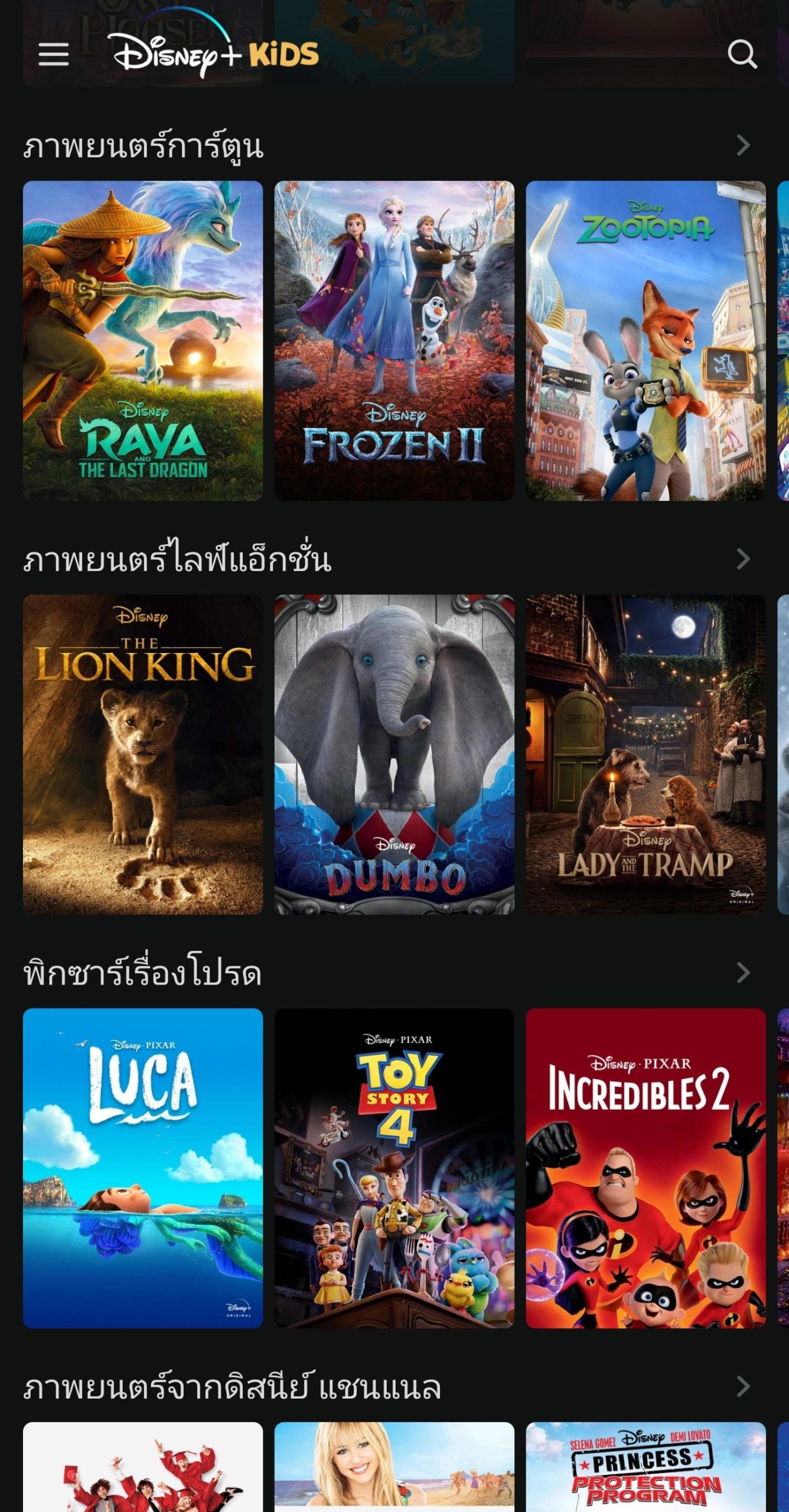 สำหรับคุณแม่บ้านคุณพ่อบ้านที่มีลูกเล็ก เราสามารถตั้งโหมด Kids ในกรณีที่จะให้เด็กเล็กรับชม เด็กๆ สามารถเลือกรับชมการ์ตูนหรือภาพยนตร์ที่เหมาะกับตัวเด็กได้เอง โดยที่ผู้ปกครองไม่ต้องกังวลว่าจะมีคอนเทนต์น่ากลัวหรือนองเลือดผ่านตาเด็ก ตั้งค่าได้ง่ายๆที่ไอคอนที่เป็นสามขีดบริเวณมุมบนซ้ายมือ