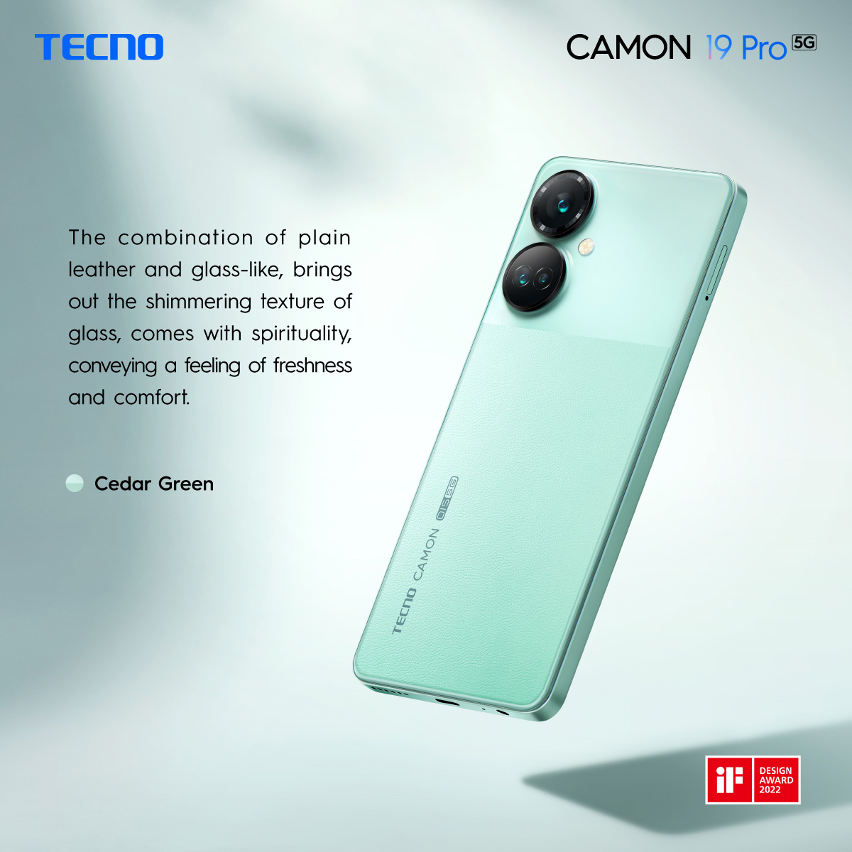 TECNO CAMON 19 PRO รุ่น 5G ใช้ชิปเซ็ต MediaTek Dimensity 810 5 G ประสิทธิภาพแรงยิ่งกว่า ห น่วยประมวลผล Arm Cortex-A76 ใน Octa-Core CPU สามารถทำความเร็วได้สูงสุดถึง 2.4GHz แสดงผลหน้าจอที่เร็วกว่ากับจอความถี่ 120Hz ดาวน์โหลดวิดีโอในไม่กี่วินาที วิดีโอคอลหรือเล่นเกมลื่นไหลไม่สะดุด รองรับเทคโนโลยีเกมมิ่ง HyperEngine 2.0 ของ MediaTek พร้อม NFC หรือ New Field Communication ซึ่งสามารถส่งผ่านข้อมูลได้แบบแตะแล้วอ่าน สำหรับใช้แทนกระเป๋าตังค์เพื่อชำระค่าโดยสาร ค่าอาหาร ฯลฯ กล้องหลัง 3 ตัว 64MP + 2MP + 2MP กล้องหน้า 16MP Pro ที่มีคุณสมบัติกล้อง AI ระดับไฮเอนด์ ให้สัมผัสอรรถรสทางสายตาชั้นเยี่ยมจากการปรับภาพด้วย AI-Bokeh และสัมผัสสีสันเต็มตาด้วย AI-Color พร้อมแฟลชทั้งกล้องหน้าและกล้องหลัง การันตีดีไซน์ที่ หรูหราล้ำสมัยจนได้รับรางวัล iF Design Award 2022 ซึ่งเป็นหนึ่งในรางวัลการออกแบบเชิงอุตสาหกรรมที่ทรงอิทธิพลที่สุดในระดับโลกเมื่อเมษายน 2565 ที่ผ่านมา