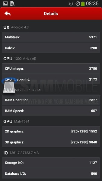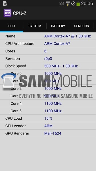 ต่อมาพูดถึง Hexa-Core บ้าง ความลับที่มันมี 6 คอร์ก็เพราะว่ามันมี CPU 2 ตัว ที่ตัวแรก คาดว่าจะใช้ Cortex-A15 ความเร็ว1.7GHz กับอีกตัวนึงเป็น Quad Coreที่ช้ากว่าตัวแรกใช้ Cortex-A7 ความเร็ว 1.3GHz แต่ชนิดของ CPU คาดว่าน่าจะเป็น Exynos 5260 ที่ยังไม่ได้ปะกาศเปิดตัว ถึงยังไงก็ตาม จาก Antutu บอกอีกว่า CPU ทั้งหมดนี้มีฟีเจอร์พิเศษชื่อ Heterogenous multi-processing (HMP) ที่มีความสามารถสั่งการให้ CPU ทั้ง 6 แกนทำงานได้พร้อมกัน