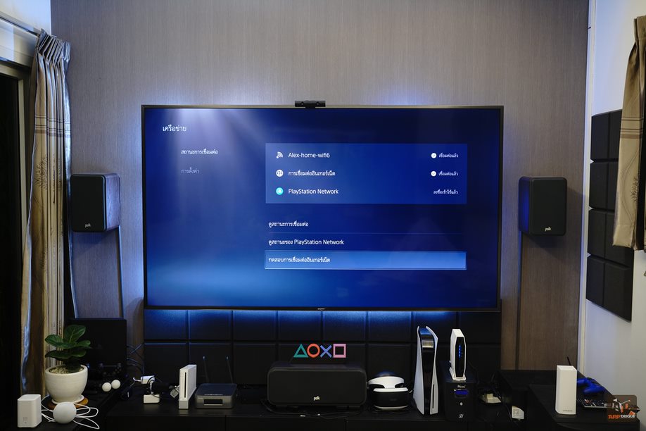 ในบททดสอบนี้ เราจะทดสอบการทำงานของอุปกรณ์ชนิดเดียวกันบน WiFi 6 ที่ปล่อยโดยเจ้า Linksys E9450 ตัวนี้ และ WiFi 5 ที่ปล่อยจาก Linksys Velop รหัส WHW03 v2 ซึ่งเป็น Mesh System หลักในบ้านหลังนี้ (มีอยู่ด้วยกัน 4 โหนด) ซึ่งห้องที่เราจะทำการทดสอบนั้นเป็นห้องโฮมเธียร์เตอร์ของบ้านที่มีอุปกรณ์อิเล็คทรอนิกในห้องเยอะมาก รวมไปถึงเจ้า PlayStation 5 และ Apple TV 4K รุ่นปี 2021 ตัวล่าสุดที่รองรับ WiFi 6 ด้วย และเราเตอร์ทั้งสองตัวนั้นวางอยู่ในห้องนี้ในตำแหน่งที่ใกล้กัน และรับสัญญาณมาจากฮับที่ต่อตรงมาจากเราเตอร์หลักผ่านสาย Lan เหมือนกัน โดยอินเตอร์เน็ตที่บ้านที่ทดสอบนั้นเป็นแพ็คเกจความเร็วดาวน์โหลดสูงสุด 1Gbps ดังนั้นผลลัพธ์ที่เพื่อนๆ จะได้เห็นนั้นอาจเรียกได้ว่ามาจากการทดสอบที่พยายามควบคุมตัวแปรเท่าที่เราจะควบคุมได้ให้อยู่ในระดับเดียวกันทั้งหมดแล้วนั่นเอง