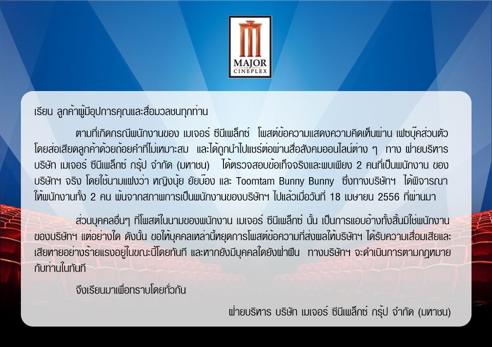 เพราะหลังจากโผล่คลิปวีดีโอฉาว ที่ผู้จัดการประจำสาขาพระรามสาม ต่อปากต่อคำขึ้นเสียงกับลูกค้าแบบไม่สมเป็นมืออาชีพ ในภายหลังยังพบว่า มีชาวเฟซบุ๊คที่ระบุตนว่าเป็นพนักงานของบริษัทเมเจอร์ซีนีเพล็กซ์ โพสข้อความว่ากล่าว ด่าทอผู้มาใช้บริการโรงหนังแบบไม่แคร์สื่อ