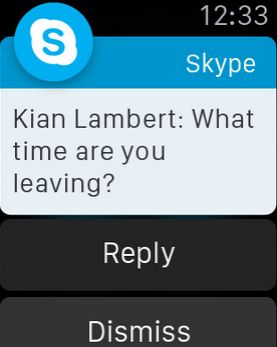 นอกจากนั้นในเวอร์ชั่นนี้ยังรองรับการใช้งานร่วมกับ Apple Watch แล้ว ซึ่งข้อดีของ Skype เวอร์ชั่นนี้คือเราไม่จำเป็นต้องพก iPhone ของเราไปด้วยก็ได้ครับ เราจะสามารถโต้ตอบข้อความที่เพื่อนเราส่งให้ได้ด้วยการแชทหรือ ใช้ฟังก์ชั่นไมโครโฟนเพื่อเปลี่ยนเสียงของเราไปเป็นข้อความในการโต้ตอบกับเพื่อนของเราได้ด้วย
