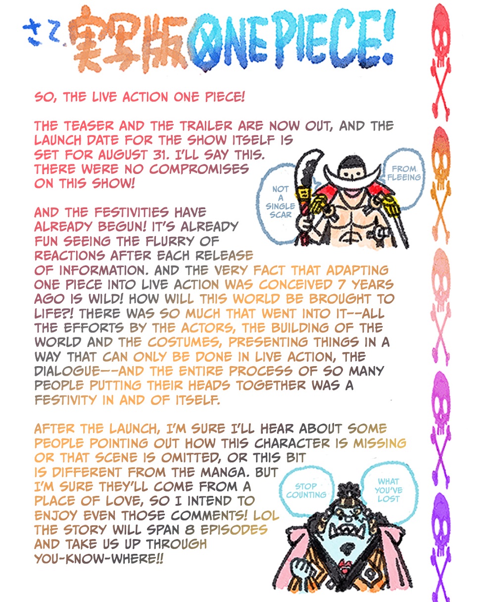 อาจารย์โอดะได้แชร์ความคิดเห็นเกี่ยวกับการดัดแปลงเรื่องราวจากมังงะสู่ซีรีส์ฉบับคนแสดงทั้งขั้นตอนการผลิต ตลอดจนนักแสดงและทีมงาน โดยอาจารย์โอดะได้กล่าวว่า “ทีเซอร์และตัวอย่างซีรีส์ปล่อยออกมาแล้ว พร้อมกำหนดวันออกฉาย 31 สิงหาคมนี้ บอกได้เลยว่างานนี้จัดเต็มไม่มียั้ง! พวกเราทุ่มเทแรงกายแรงใจกันสุดๆ ทั้งจากทีมนักแสดง ทีมที่รังสรรค์โลกของวันพีซ เสื้อผ้าหน้าผม ให้ออกมาเป็นผลงานที่ทำได้ในฉบับคนแสดงจริงเท่านั้น