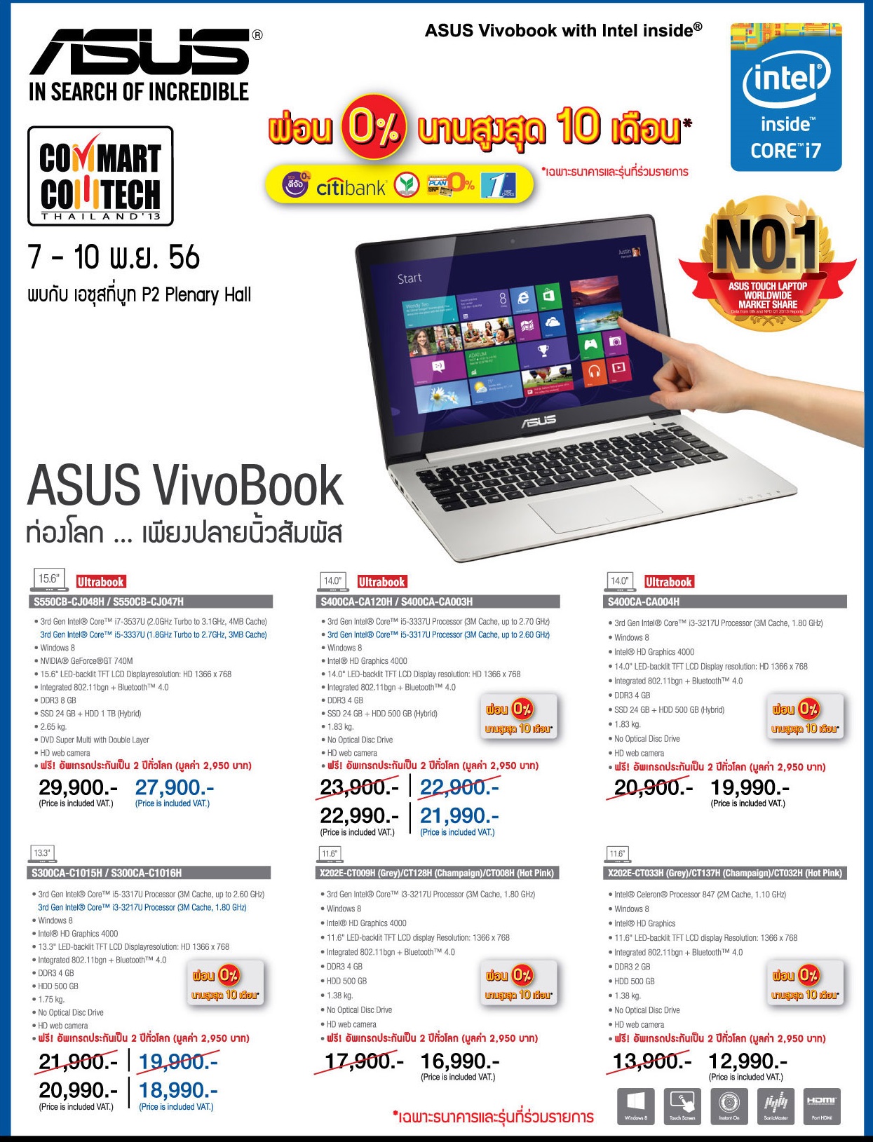 นอกจากนี้ “เอซุส” ยังมีสินค้าโน้ตบุ๊คอีกหลากหลายรุ่นที่มาลดราคา แถม ผ่อน ให้ได้ช้อปกันจุใจ อาทิ ASUS X-Series, ASUS K-Series, ASUS Taichi และ ASUS Transformer Book (เฉพาะรุ่นที่กำหนด) สำหรับธนาคารที่ร่วมรายการ อาทิ กสิกรไทย, กรุงศรี, เฟิร์สช้อยส์, ไทยพาณิชย์ และ ซิตี้แบงค์ ซื้อโน้ตบุ๊กวันนี้…ฟรี!! อัพเกรดประกัน 2 ปีทั่วโลก โปรดสอบถามในงาน “Commart Comtech Thailand 2013” ได้ตั้งแต่วันที่ 7 -10 พฤศจิกายน 2555 ณ บูท เอซุส P2 Plenary Hall ศูนย์การประชุมแห่งชาติสิริกิติ์