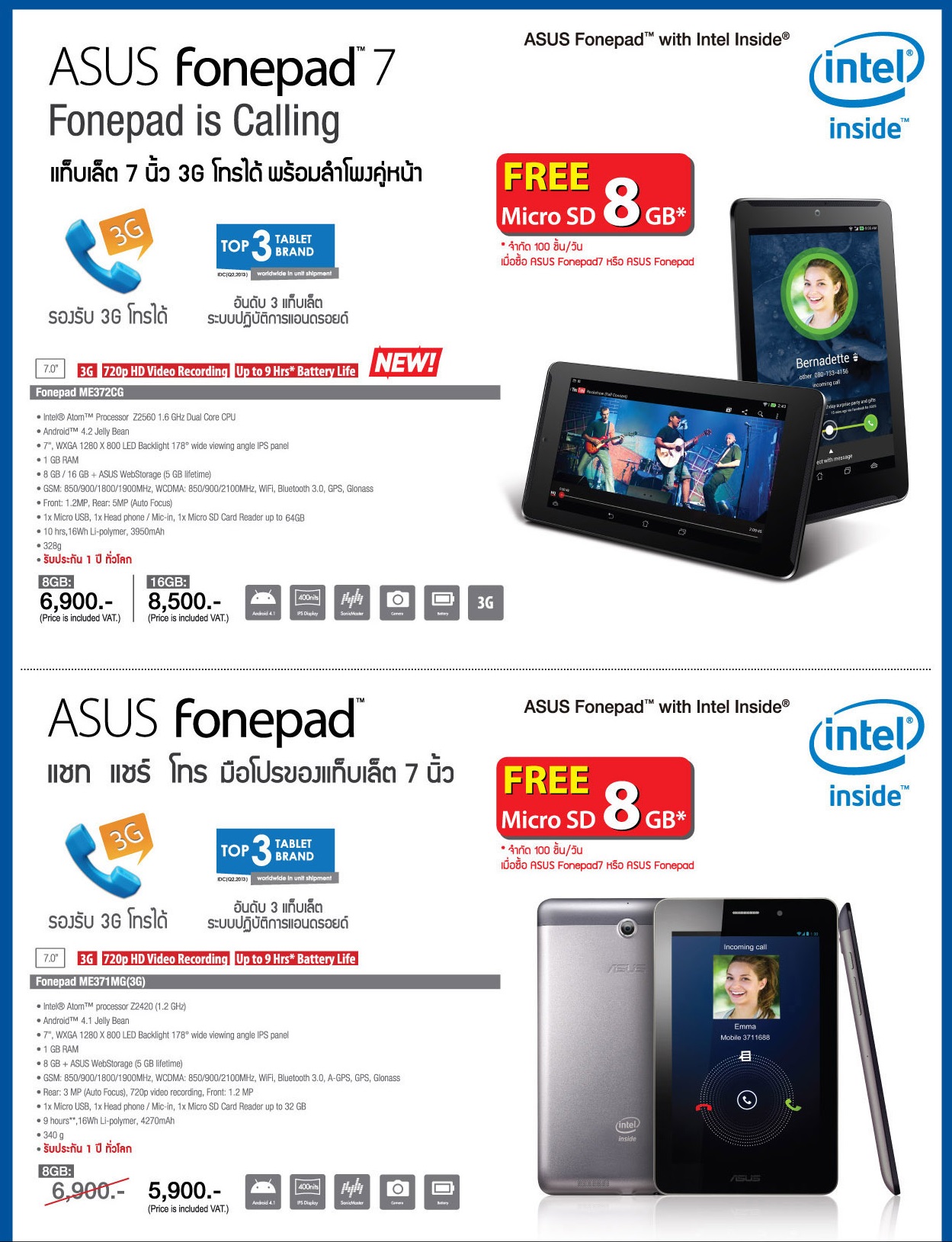 สำหรับผู้ที่ต้องการสินค้าแท็บเล็ตโทรได้ รุ่นใหม่ล่าสุด สเปคดี คุณภาพเยี่ยม ไว้ตอบสนองทุกความบันเทิง เอซุสขอแนะนำ “Fonepad 7” หน้าจอขนาด 7 นิ้ว ความละเอียด HD 1280 x 800 ขับเคลื่อนด้วย Intel Atom Z2560 dual-core 1.6GHz แรม 1GB รองรับ 3G ทำงานบนระบบปฎิบัติการ Android 4.2 Jelly Bean หน้าจอแสดงผลแบบ IPS ลำโพงสเตอริโอหน้าคู่ ที่ทรงพลังเสียงด้วยเทคโนโลยี SonicMaster มีให้เลือก 2 สี ทั้งสีขาวและสีดำ สำหรับความจุ 8GB ในราคา 6,900 บาท (รวมภาษีมูลค่าเพิ่ม) และความจุ 16GB ราคา 8,500 บาท (รวมภาษีมูลค่าเพิ่ม) พร้อมแถมฟรี MicroSD 8GB จำนวนจำกัด 100 สิทธิ์ต่อวัน เมื่อซื้อ Fonepad 7(ME372) หรือ Fonepad(ME371)